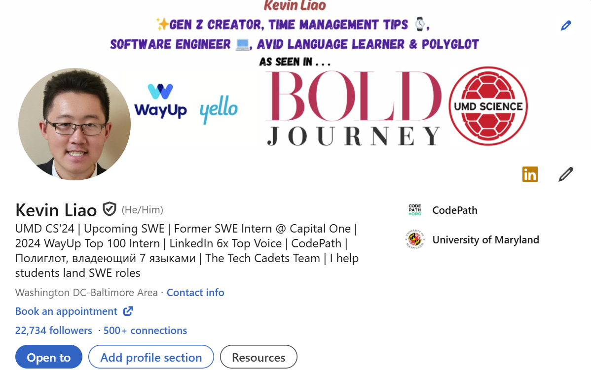 I recently graduated from the University of Maryland, College, Park, with a degree in computer science. Over the past year, I’ve passionately shared my journey in tech and career tips on LinkedIn, offering advice on landing software engineering internships and transitioning into full-time roles. I’ve also had the privilege of serving as a Career Peer at CodePath, a nonprofit dedicated to increasing diversity in tech. In this role, I’ve provided tailored resume and LinkedIn feedback to hundreds of students, guided them through job search strategies, and spoken at webinars on succeeding in internships and technical interviews.