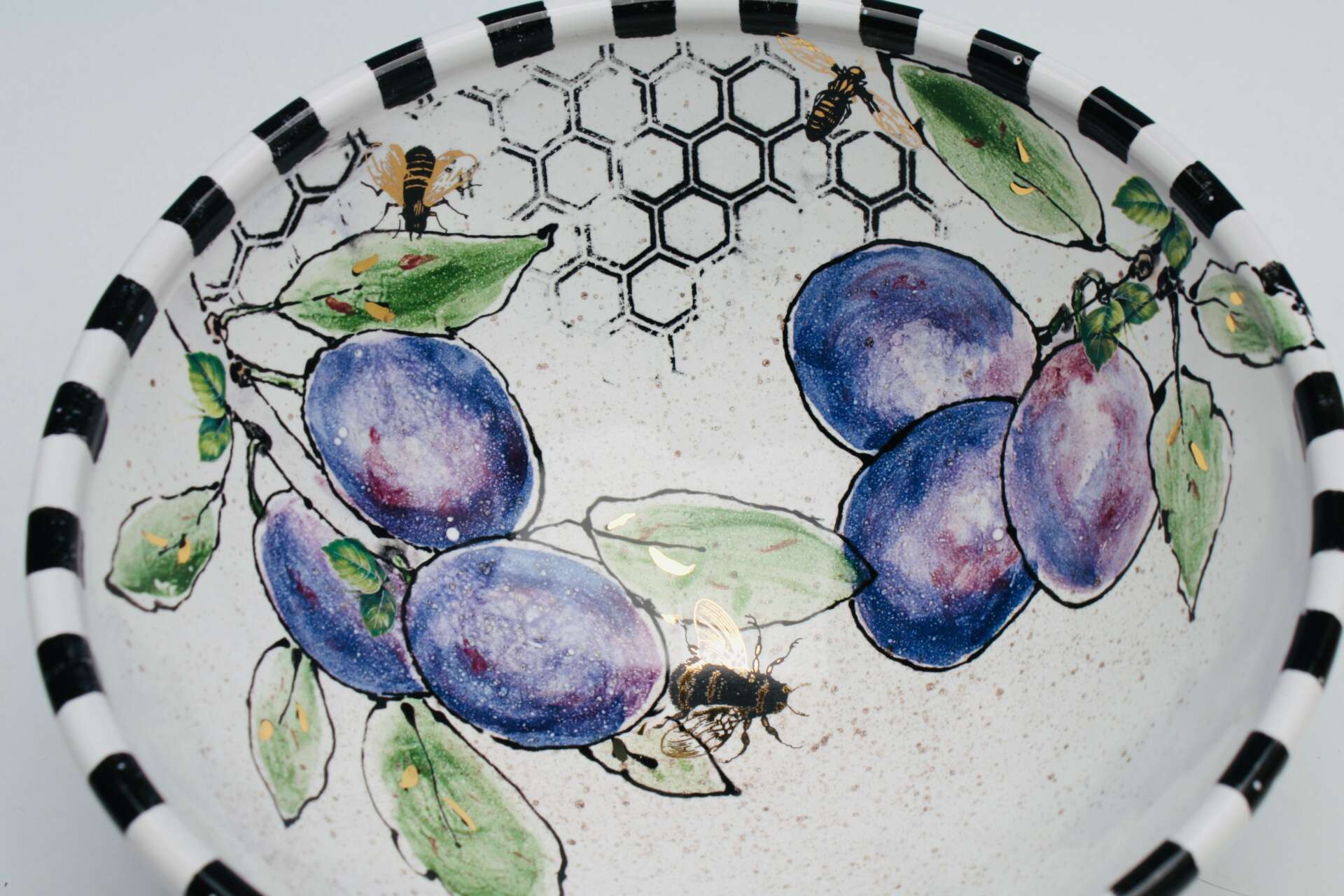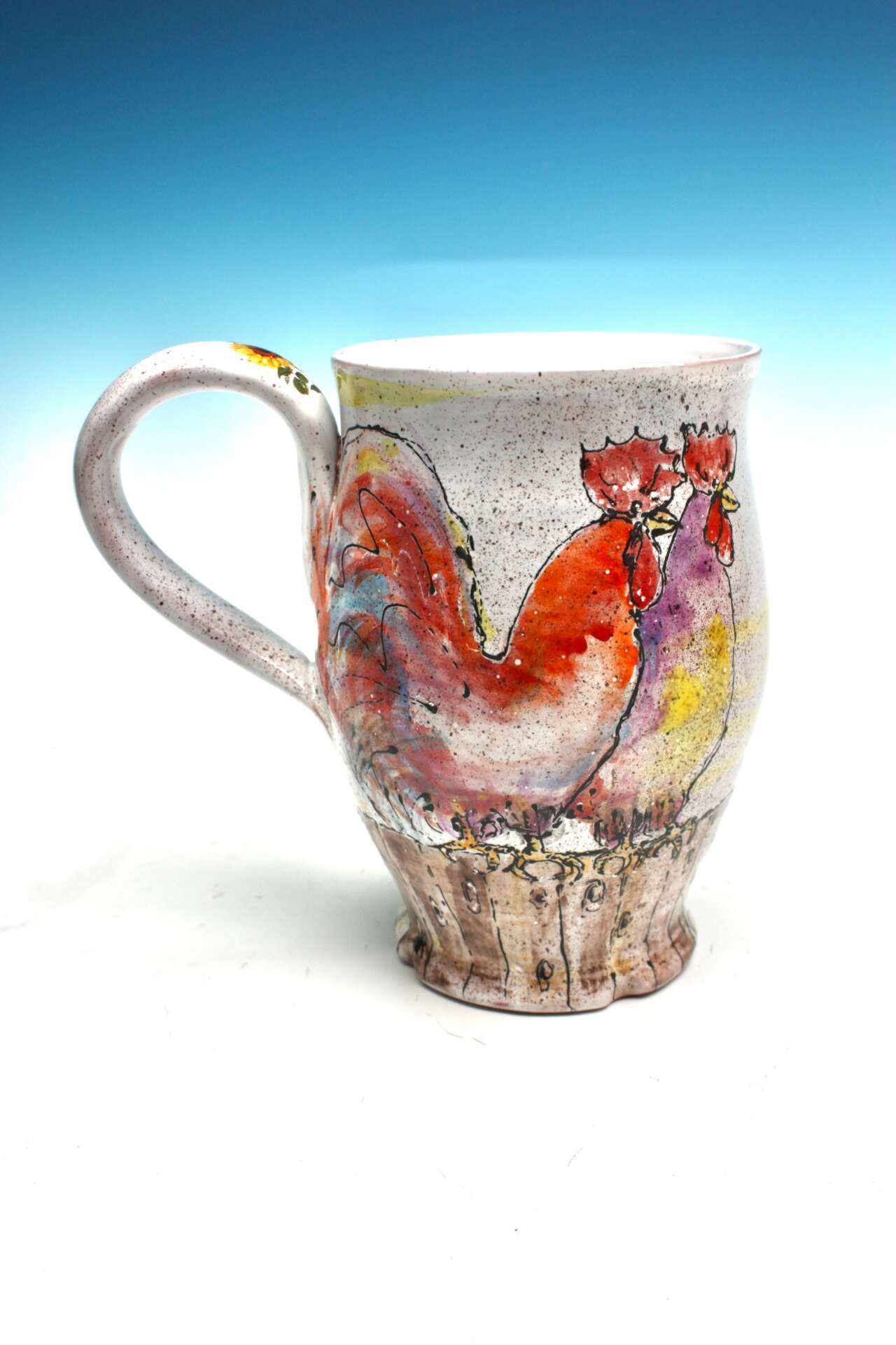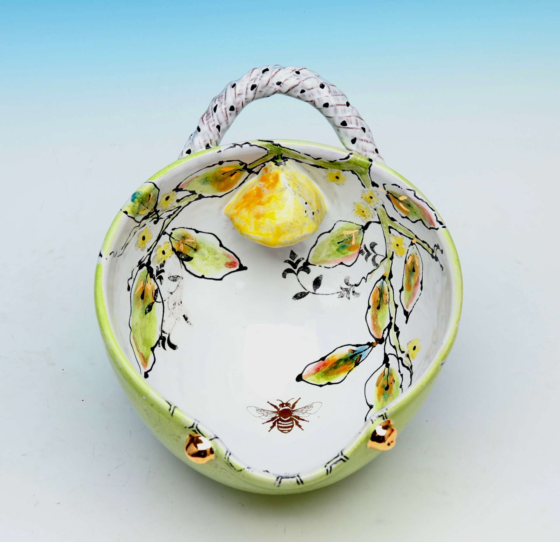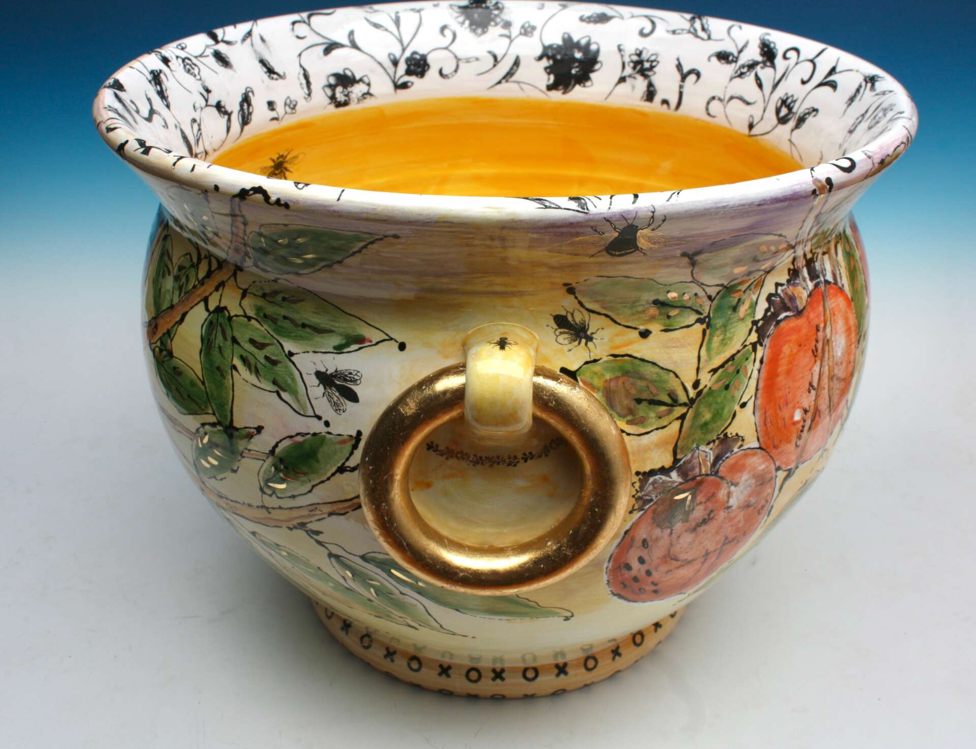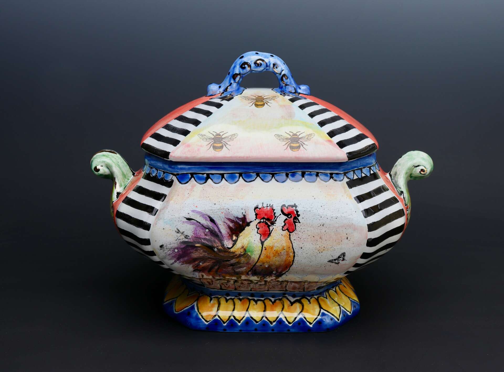 I joined a theatre group when I was 8 years old. I wanted to be the 60’s version of Shirley Temple. That was both my dream and goal for 40 years. I managed to book the lead in 30+ plays, moved to Los Angeles at age 21 to (struggle) as a TV actor. After 11 years, I booked 2 great roles in Orlando, Fl. I had 2 little kids in tow and decided to move back to my hometown of Tampa. Trying to remove myself from a bad marriage, I stumbled upon a pottery class in 1989. My world changed. I had been a successful hand model and never got my dainty little fingers dirty in my life. This was going to change everything. I share the ceramic stage today with that brilliant clay teacher! My initial goal of taking a 6 week clay class was to find a way out of my marriage, by focusing on creating something useful and beautiful. I have reached goals in my pottery career that I never got close to earning as an actor. I love the control I have over what I create, how many hours I work, how many art show’s I enter and which collectors I LOVE to make work for. I am most proud that I’ve done all of this with 24/7 chronic pain. After 2 car accidents, scoliosis, 2 failed back surgeries… I have found that my focus while painting eye lashes on a Tango Dancer and veins on a bumble bee, redirect my pain away from my brain. After all; I’m in pain every minute so why not make pretty pots?!