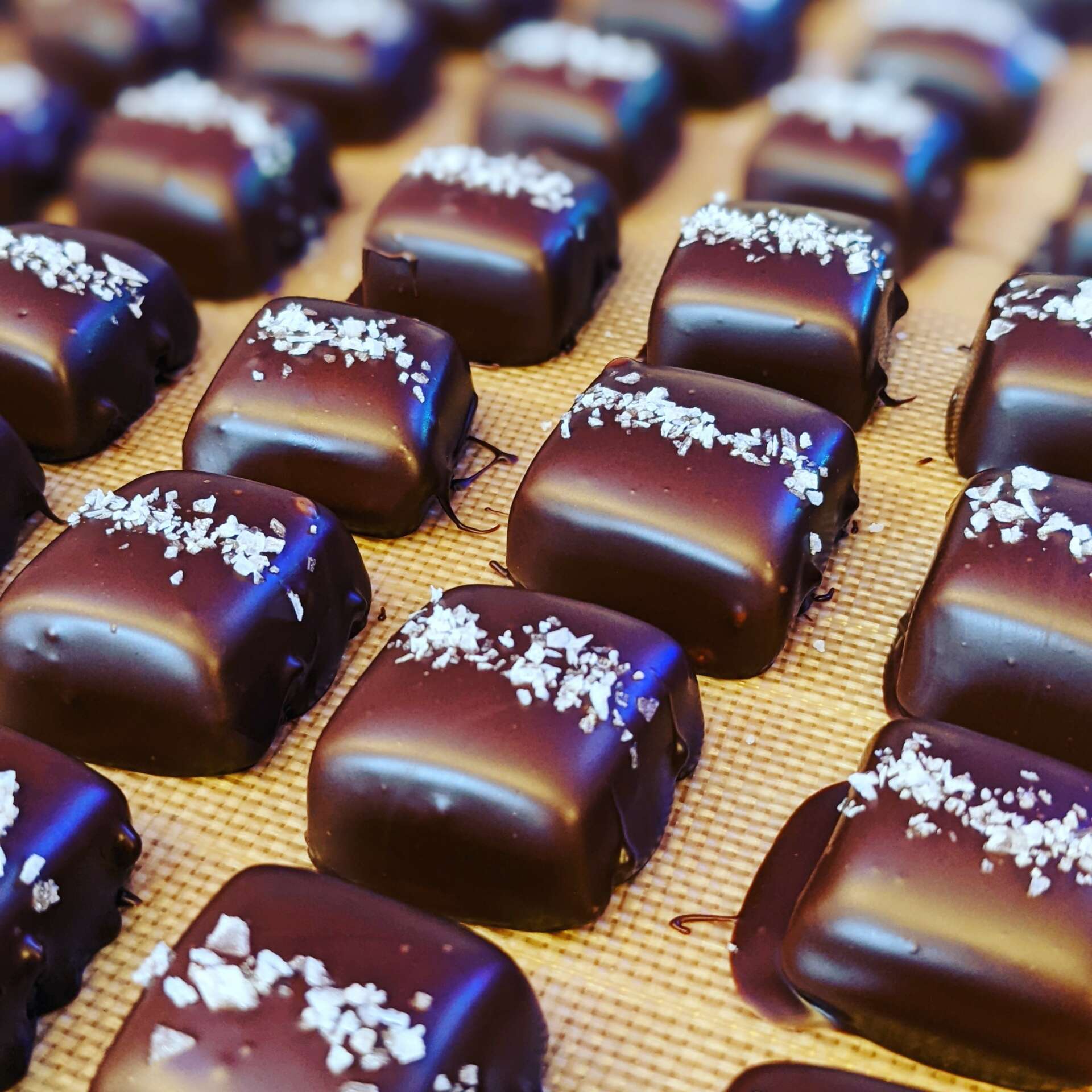 I think the biggest difference between myself and other confectioners/chocolatiers is the fact that I stay away from the ‘flashy’ styles. No molds, no airbrushing. While, beautiful, I feel like there is something about perfectly tempered chocolate on it’s own that it doesn’t need all of that. It also means that absolutely every since piece of what I do is made by hand. Truffles are hand rolled and hand dipped, and instead of bright colors, they are usually topped with one of my other creations–candied nuts or candied peels. This is why the ‘flavor over flash’ became my brand. I don’t want to dress up what I do as something else, and I don’t tend to follow trends. I just want people to bite in and know what they’re tasting.