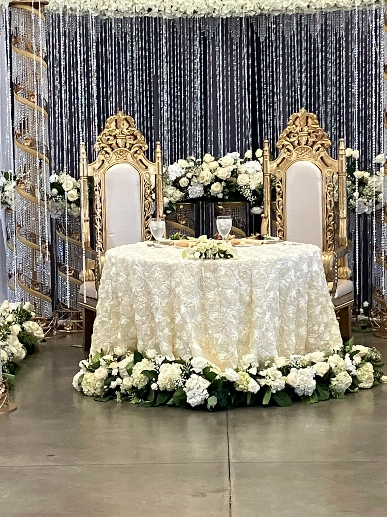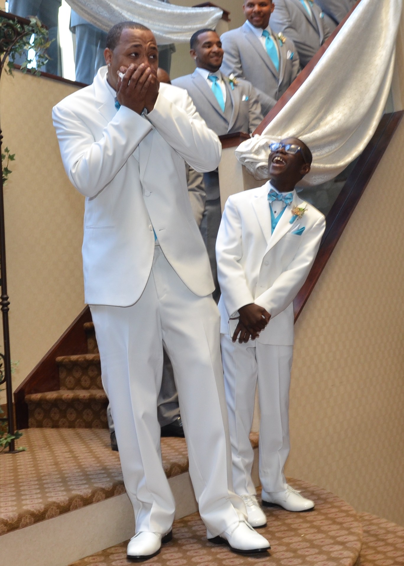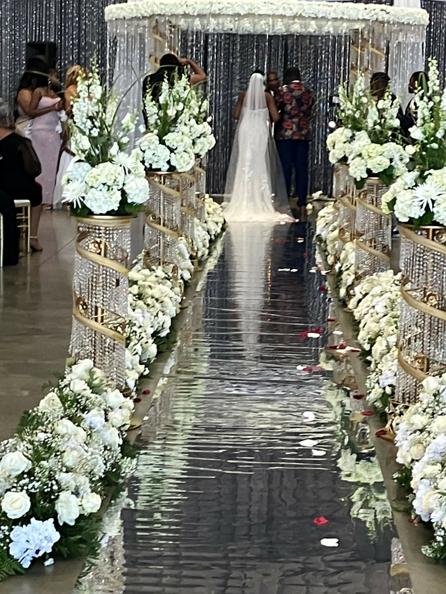 The next day, Tara called excitedly, thanking us for her dress. The ladies and I arrived at the church early. It was a beautiful church, so I decided to explore. In my exploration, I overheard the groom (Cory) speaking with his sister about Tara’s entrance song. It seemed Cory’s sister was slightly hoarse and couldn’t sing the entire song. They struggled with other options. I had heard enough when I excused myself for overhearing. I gave the option for Cory to take over and sing Tara down the aisle. They both loved it and decided it was to be a secret. I joined the ladies as the ceremony was starting. Tara had a big smile on her face and looked beautiful in her dress as she and her father walked down the aisle. Then Cory’s melodious voice (similar to Larry Graham) took over the song. Tears rolled down Tara’s face as she walked to her future. Cory finished the song Frank Sinatra style as he descended the stairs and took Tara’s hand.