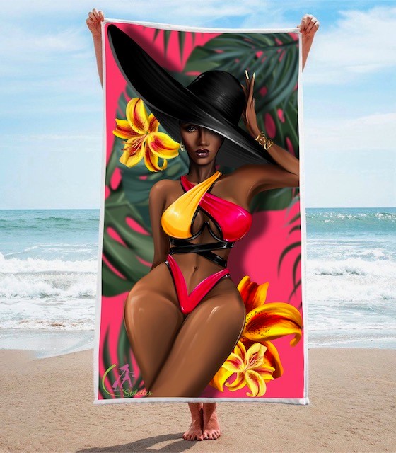 So, I began searching on the internet for beach towels fitting that description, and I could not find what I was looking for. Typically, you won’t see illustrations of people on beach towels, and illustrations of black women on beach towels were even rarer.