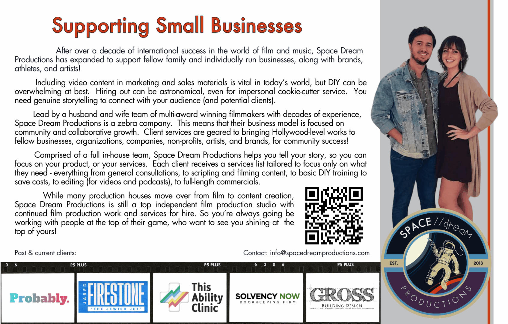 Space Dream Productions is a zebra company, which means we value community, sustainable growth (meaning viable for long periods of time and going into the future, not just recycling), and mutual success for those we work with. We know there are billions of people in the world, and no shortage of creatives or those who need creative services, so collaboration is at our core. Those values influence everything we do, and help me stay focused on not just the bottom line, but also the value of the services we’re providing to people and the quality of the films we’re putting out into the world.
