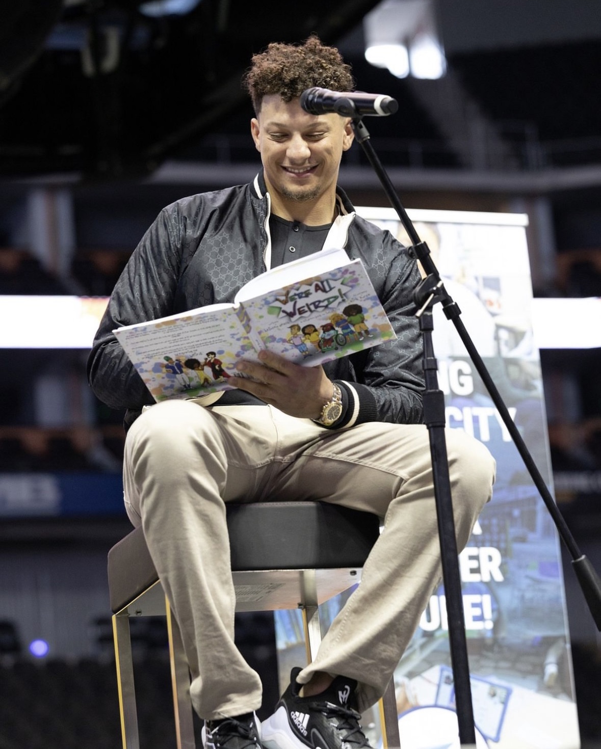 photo of Mahomes reading We’re All Weird! credit to Lead to Read KC
