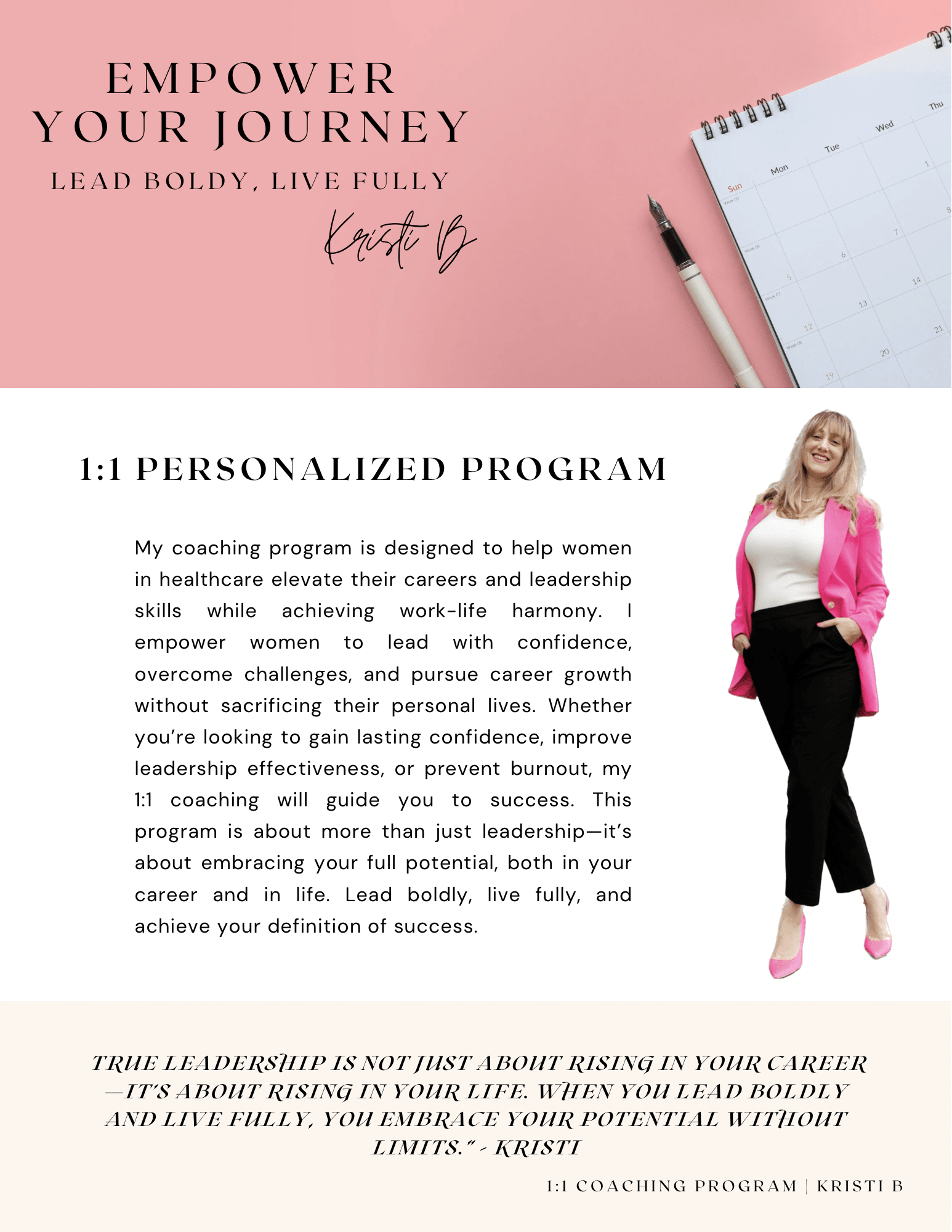 I offer personalized 1:1 coaching through 6 week or 90 day programs focusing on building confidence, enhancing leadership skills, career clarity, growth and promoting work life harmony and health that prevents burnout and fosters achieving without loosing yourself or your life in the process.