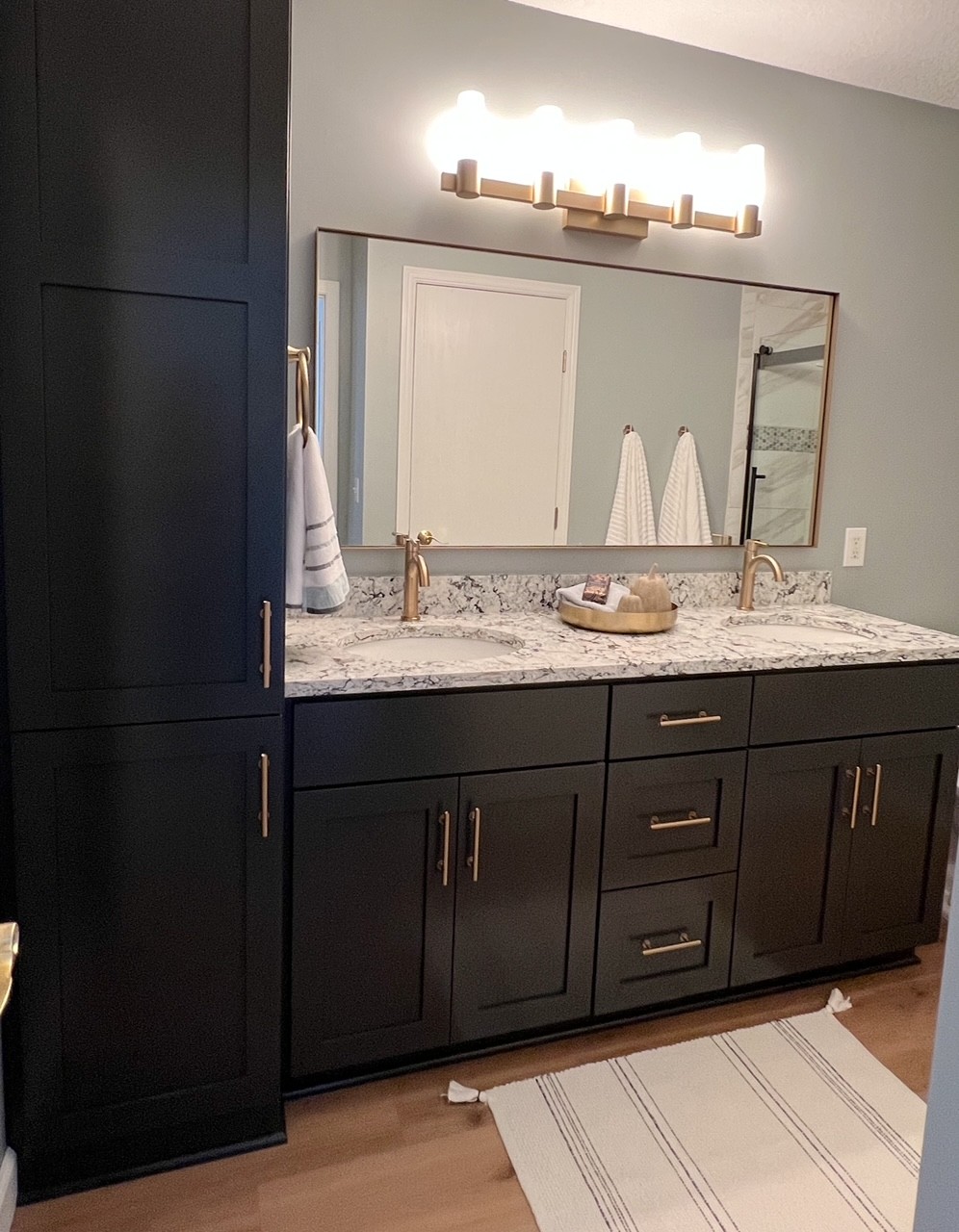 I was recently working on a bathroom design plan for a client. They were gutting the bathroom and would be painting new vanities. I encouraged them to go dark. This couple was split on the thought of it; one loved the idea and one was worried it would be too dark. They did end up moving forward with recommendation of Sherwin Williams Iron Ore 7069 and love it! The walls, countertop and new tiled shower are a bit lighter, so the room feels very bright.