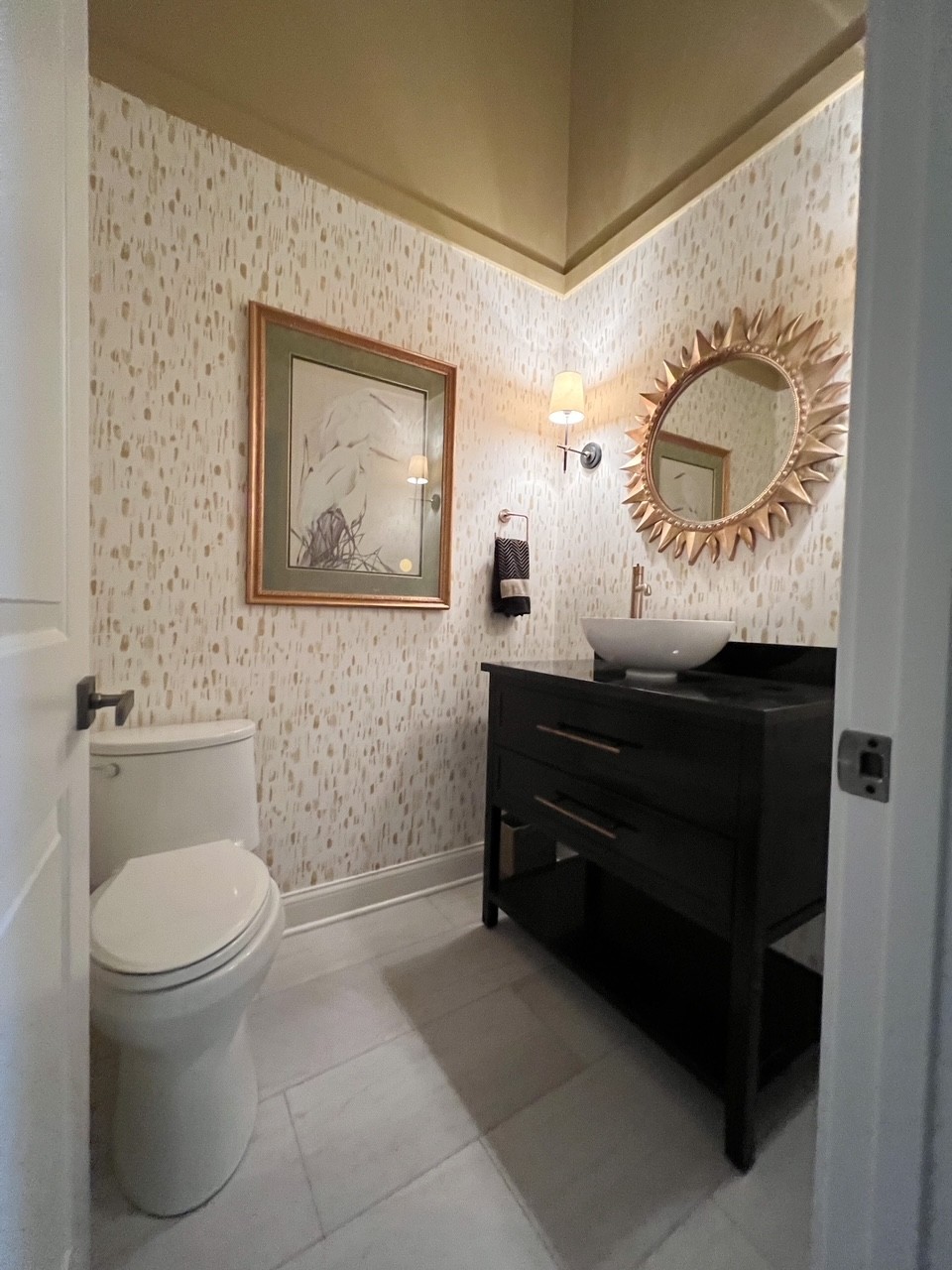 I was recently working on a bathroom design plan for a client. They were gutting the bathroom and would be painting new vanities. I encouraged them to go dark. This couple was split on the thought of it; one loved the idea and one was worried it would be too dark. They did end up moving forward with recommendation of Sherwin Williams Iron Ore 7069 and love it! The walls, countertop and new tiled shower are a bit lighter, so the room feels very bright.