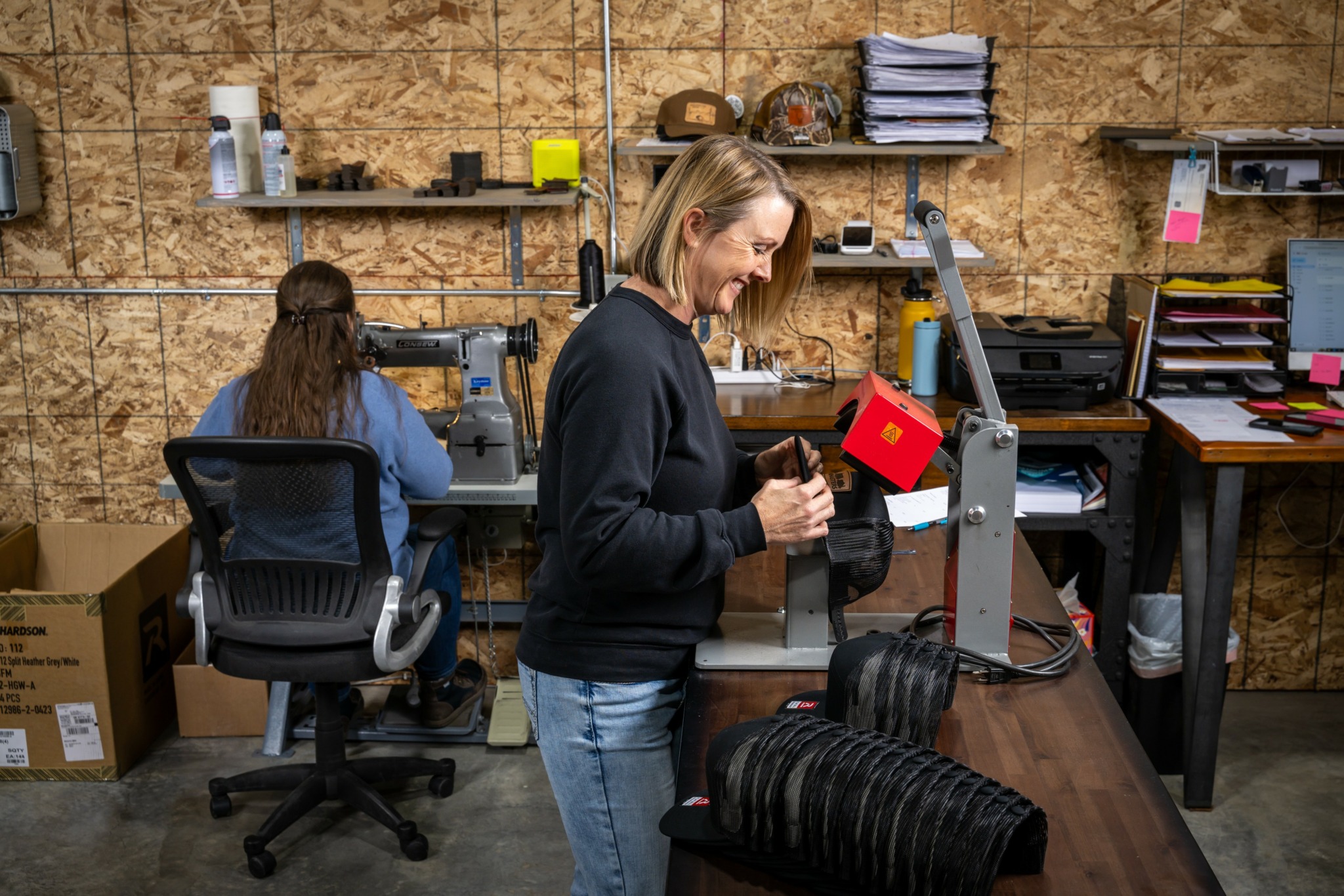 The sewing portion of our business story looks a bit different. In the beginning I outsourced it to another local company, but was really disappointed in the quality of work. That company was the only company in the area willing to take on the work, so I quickly decided to purchase my own industrial sewing machine and learn how to sew. It was another “setback” that I had to make a decision to either throw in the towel, or be willing to invest more time and money to build a business and product I was proud of. I eventually tracked down a 1970’s industrial sewing machine that fit our budget. I hauled it back to our garage, hired a guy to come service it and teach me the basics, and spent the next few months honing in my skills/ruining more hats than I care to admit! We now have two sewing machines, one new and our original 70’s machine. The original is by far our workhorse that we do about 90% of our sewing on.