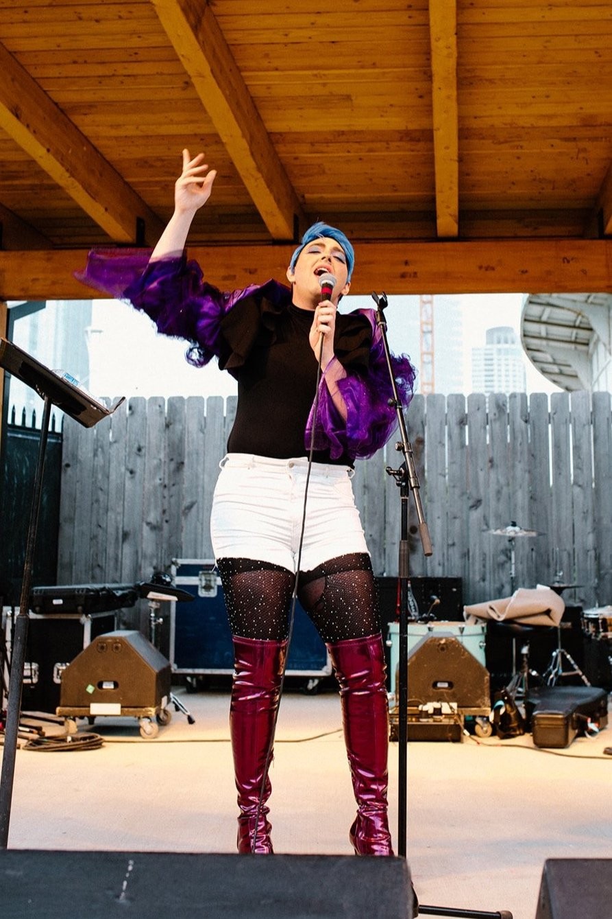 I have been a singer since I was 6 years old, when I started regularly performing in musicals. As I entered high school, I developed a keen interest in opera and also the business world, so when I got to college, I was still an opera singing major, but my future focus pivoted to the business side of the arts. When I turned off my “performer switch,” I started writing my own music just for “fun.” Having taken a hiatus from being an entertainer to do nonprofit corporate partnerships, a car accident left me with enough mental health challenges to reignite my love of performing. The accident knocked me into rediscovering my inner self: the theatre kid who needs to perform to fulfill my true purpose.