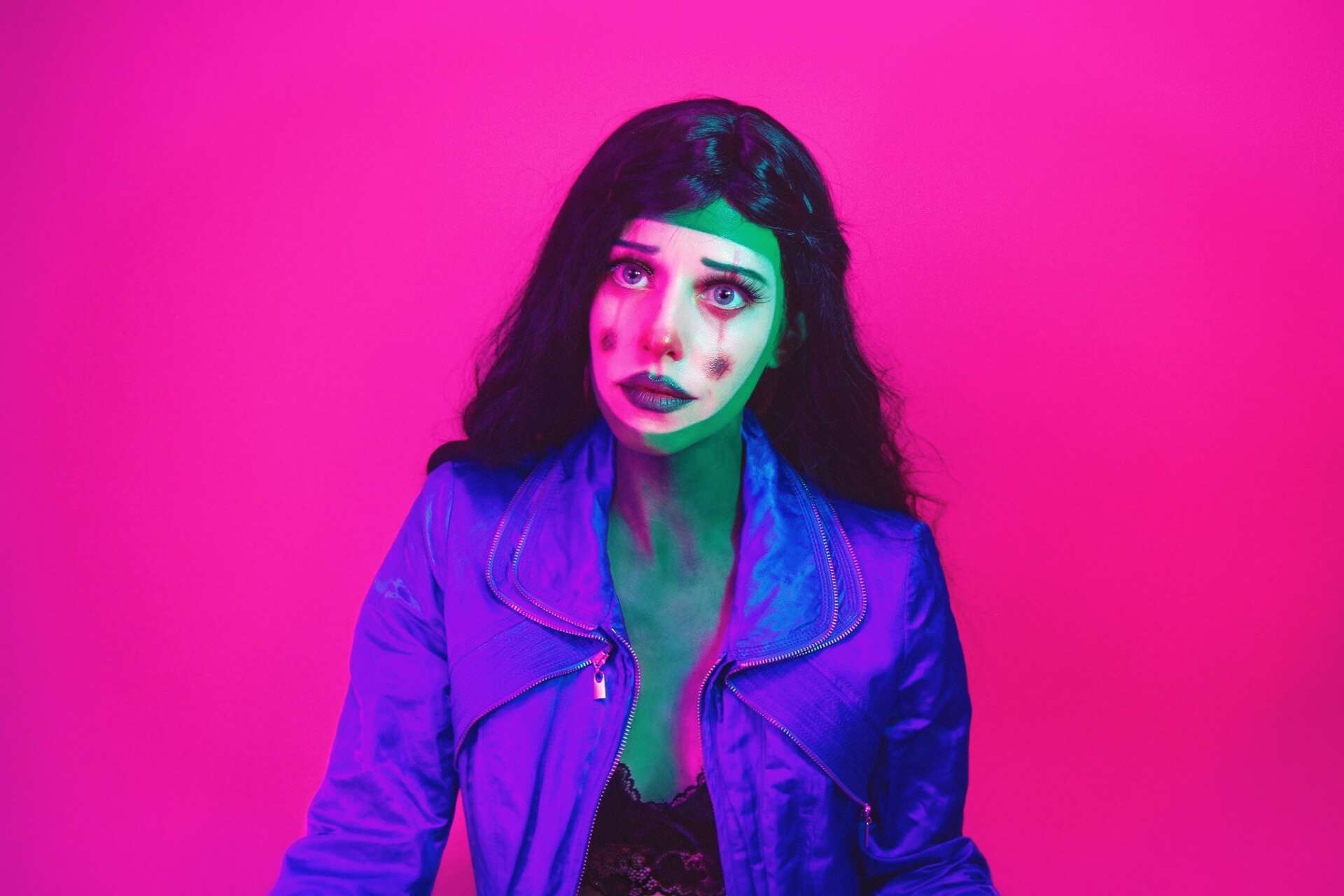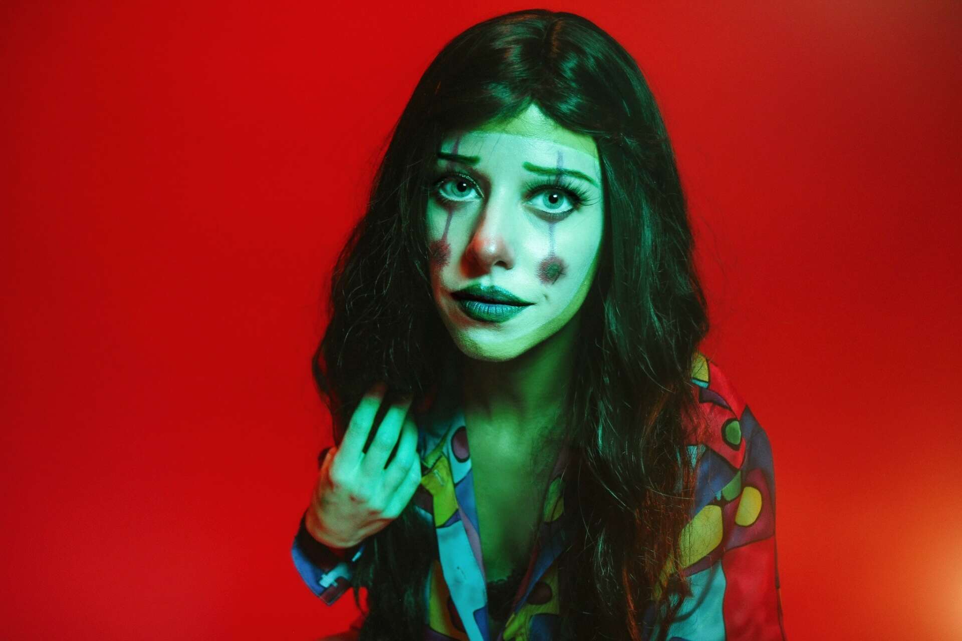 For most of my life, my father was an addict. He was both absent and present in my life. I watched him repeatedly choose drugs and alcohol over family. During the times he was present I would try keeping him afloat by bailing water out of his sinking ship, always to be followed by him pouring more back in. This was my role for 24 years, which is the age I realized my efforts would always be futile. 4 years later he lost his battle. Life seemed to halt as I saw every detailed emotion I’d ever felt towards him; the love, the disappointment, the hope of him changing. Though I had this personal clarity, I still struggled to vocalize my grief. The week following his death I took a series of self portraits. I painted my face, threw on a wig, and proceeded to spend 2 hours alone in a room taking selfies. The series is called ‘Sad Alien Clown’. The process of embodying a clown entailed painting on the emotions I wasn’t able to articulate with words. Colorful contradictions; Sad Clowns tend to their sorrows with smiles and laughter. A beautiful paradox I related with during a time I felt unrelatable. To integrate this feeling of isolation, I included alien imagery throughout the pieces as well.