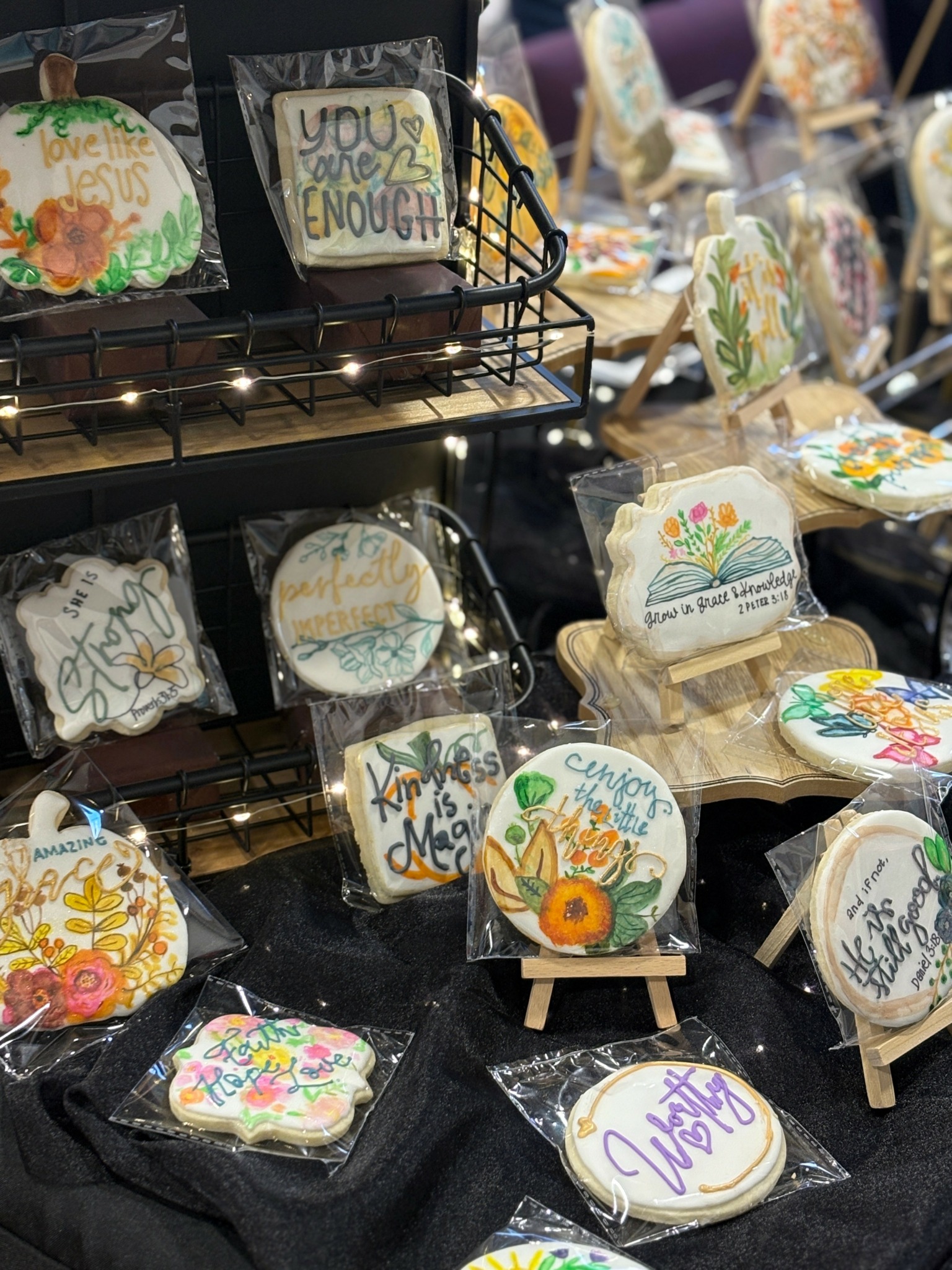 my name is lacie walters, my husband Gabe and i have been married 27 years and we have 3 children and 1 grandson. i started making cookies for my children and once they were grown decided to try something different. i love to paint my cookies and when i take them to markets or events each cookie is different with an inspirational message written on them. the idea is a cookie instead of a card. i am most proud of the positive message that i can provide to others with a simple cookie. you never know what someone is going through and when someone walks to my booth picks up a cookies with a message on it and says “i needed that today”, that is why i love what i do. the hardest part is juggling everyday work and life and keeping up with orders and events.