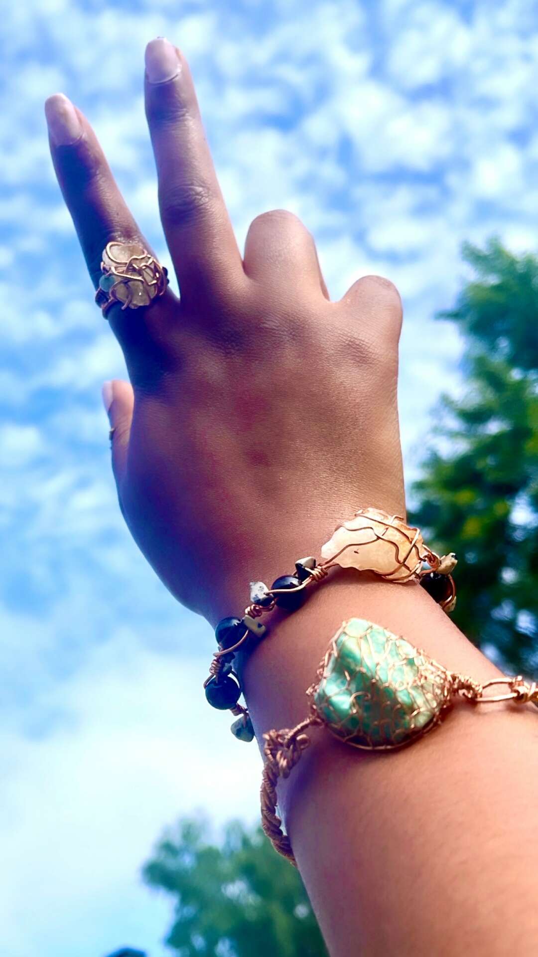 As mentioned, I began this Journey 3 years ago when I first began my healing journey. I am a partner, and a mother of 2 beautiful babies. I wanted to be the best version of myself for them and for ME. I began using crystals to aid me on this journey and decided that I wanted to carry mine with me throughout the day. That idea lead to me decided that I wanted to wear them because their beauty deserved to be seen. that day I purchased my first set of tools for wire wrapping. I was so proud of my first creation. The first day I wore My lapis Lazuli Pendant to work, I like to say that it “called out” to two people. They asked questions, compliemented it and they wanted one! I started wrapping crystals which I call “Creating Homes” for the crystals. As I purchased more crystals, and shared my creations more and more people wanted them. I came from selling my creations to friends and people I know, to shippping my “peace’s” As far as Alaska. I am checking off a new state weekly and I am so grateful!