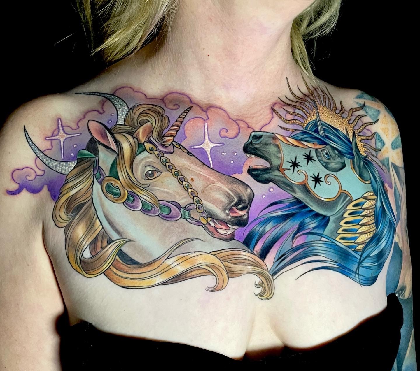I have been focusing on an ornamental, art nouveau style of tattooing that incorporates soft color with bold black flourishes; shapes that flow to accentuate the contours of the body. Much of my inspiration comes from growing up in Europe and witnessing the wealth of art history that exists there in abundance. I’m particularly inspired by Baroque, Neoclassical, Romanticist, and Art Nouveau/ Art Deco periods in art history.