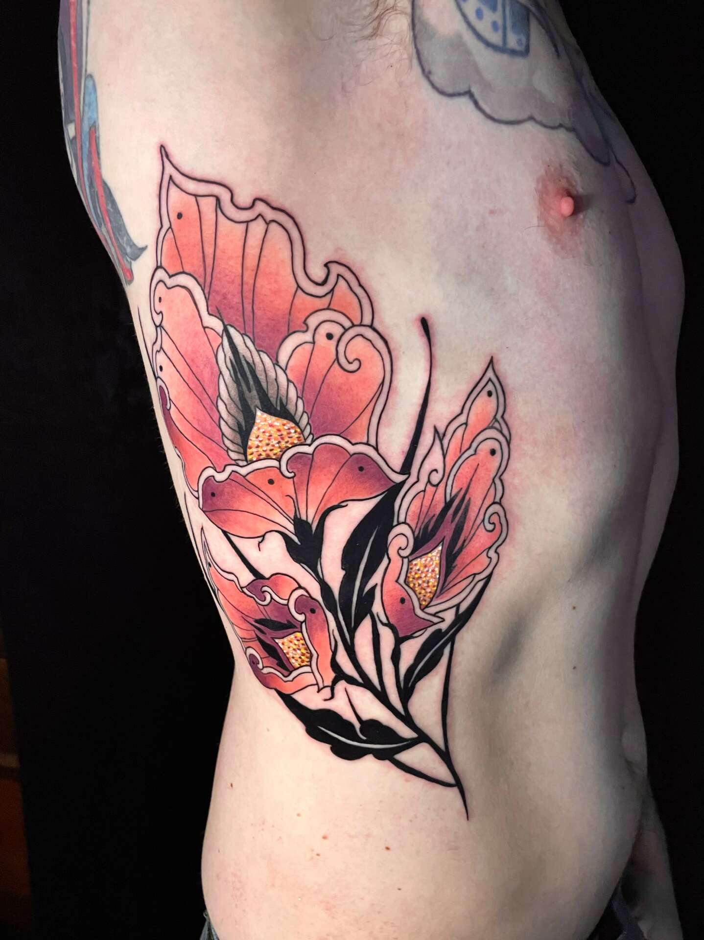 I have been focusing on an ornamental, art nouveau style of tattooing that incorporates soft color with bold black flourishes; shapes that flow to accentuate the contours of the body. Much of my inspiration comes from growing up in Europe and witnessing the wealth of art history that exists there in abundance. I’m particularly inspired by Baroque, Neoclassical, Romanticist, and Art Nouveau/ Art Deco periods in art history.