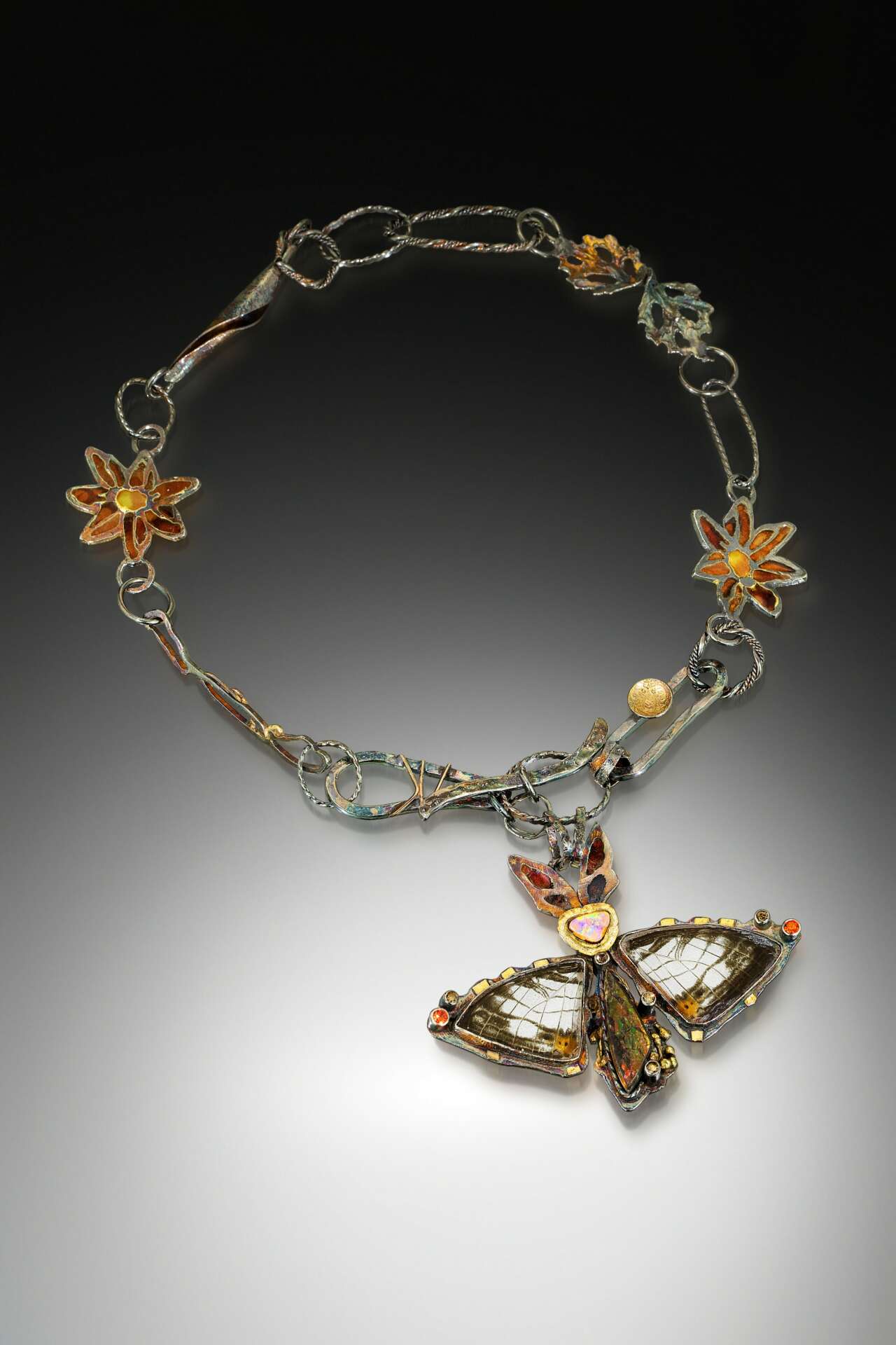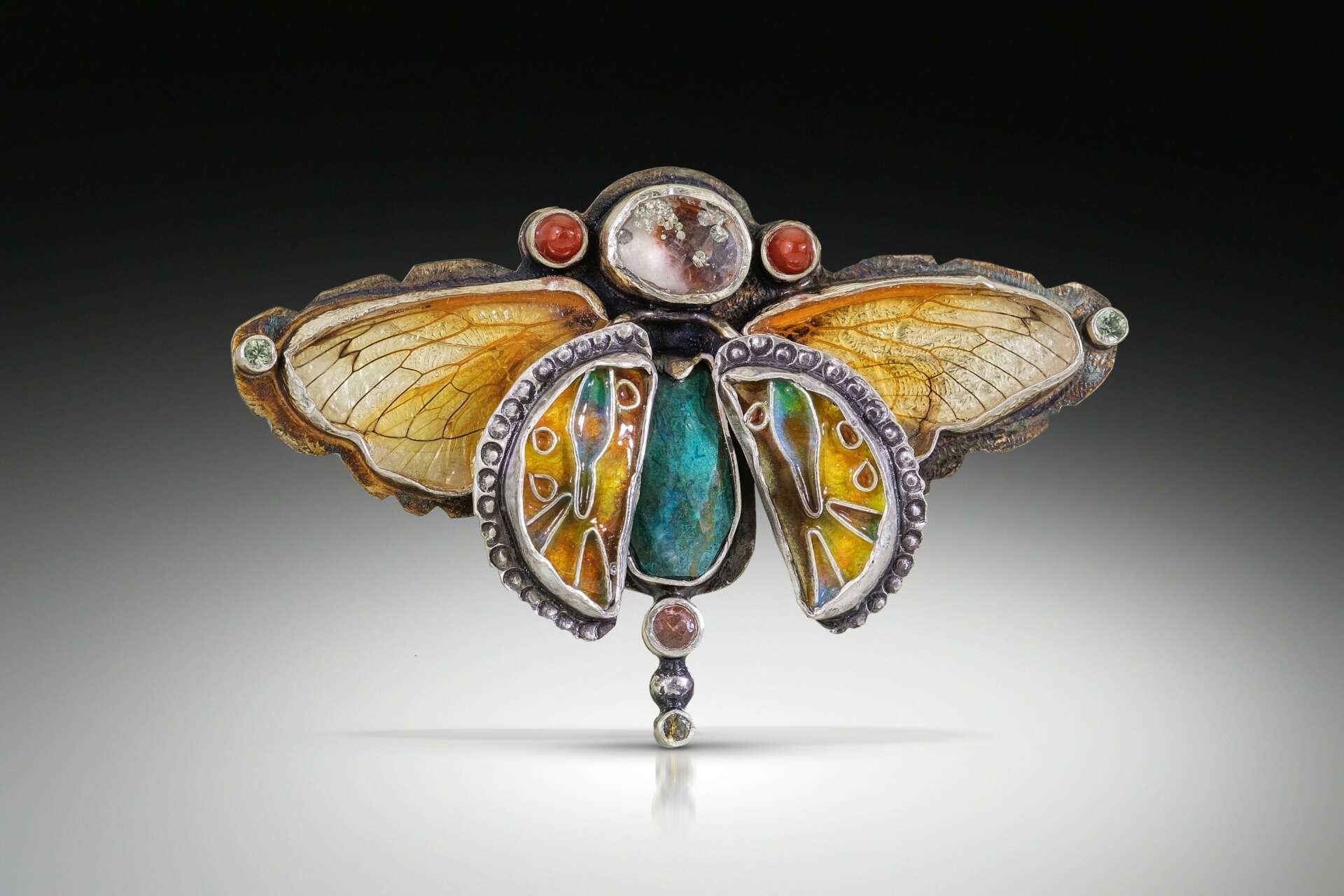 I cannot remember a time when I wasn’t creating something. As a child, when I ran out of paper, I started to draw on the walls. In my early teens, I drew and painted pictures on my clothes and painted pictures on seashells that I turned into jewelry. Although my art background is painting, I have been making art jewelry for over 30 years, My work is in a constant stat of evolution. I love experimentation and I love to break the rules. Recently a collector of mine sent me a box of dead cicadas. I have been encasing their beautiful, fragile wings in optical quartz with 24kt gold. Using lapidary equipment, I have been making cabochons of the wings to create one of a kind wearable heirlooms of the future. This process has opened up an entirely new rabbit hole for me to fall into!