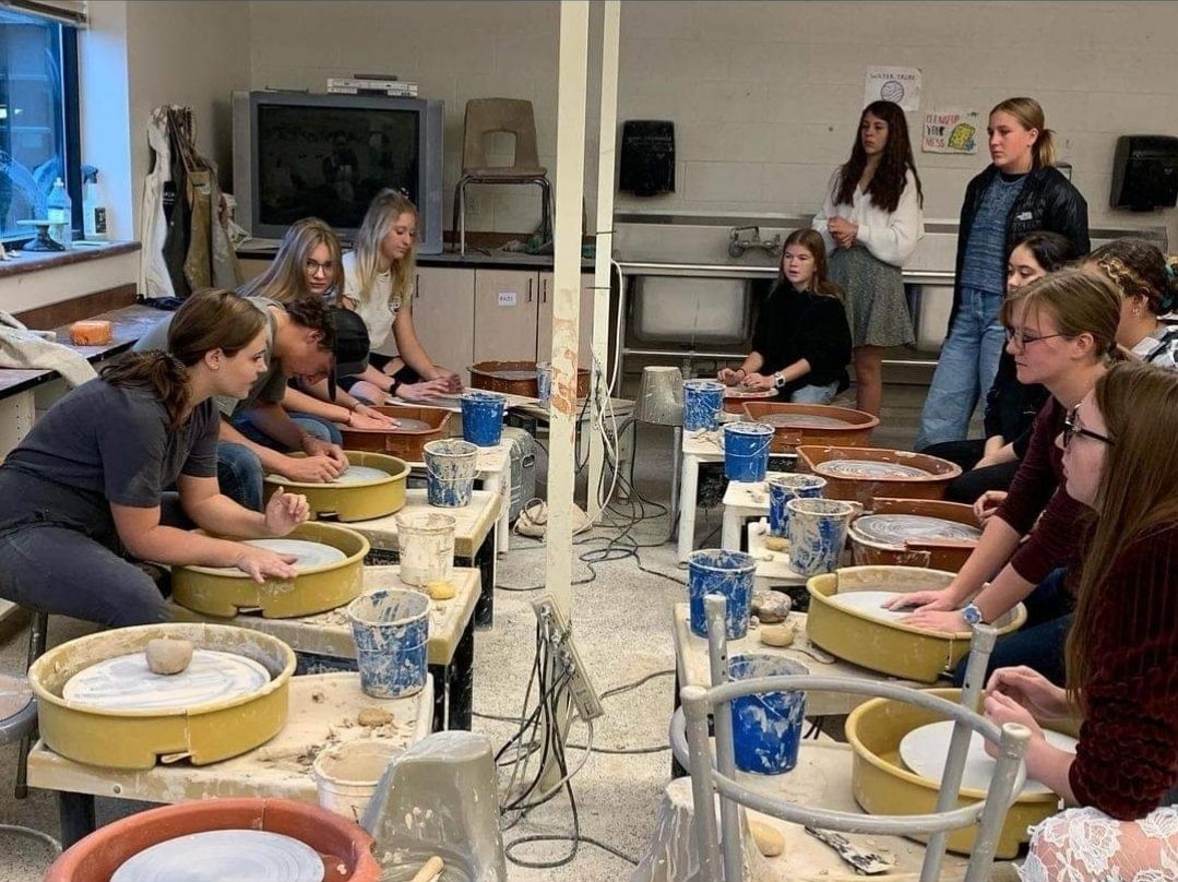 When I graduated with my teaching degree and started teaching in 2020, I started to get very overwhelmed and really missed creating for myself. At that time, I had to find joy in the teaching aspect while finding time for my own creativity. Before this time, I thought I would make art for a side hobby while teaching. I then had to make a choice whether or not teaching was going to consume my time or if I was going to continue to sell my art and be in art galleries. Making the switch to selling while teaching was very difficult. I found myself a first-year teacher not leaving school until after six because of the studio needs. At that point there was no energy or time left for me to create for myself. That is when I started to work on projects and my skills with my students. Not only did my students start to understand and create better work but I started to find more joy in teaching. A favorite project of mine is sculpting hands. Each semester I sculpt my own hand along with my students and each year I continue to improve. My students help drive me as a teacher and a creative. When I see them working hard and improving it makes me want to improve as well. By the end of my first-year teaching, I had built up enough of my own work from helping and teaching my students that I was able to participate in my first farmers market. Soon after that, I opened up my own private studio with a pottery wheel in my basement. I now work hard creating work throughout the year, after school, and during the summer to participate in many art galleries and markets.