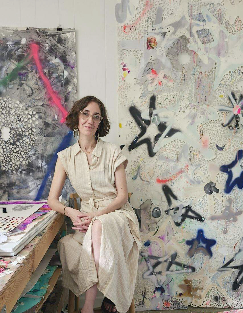 I identify as a painter; however, I usually work on and with paper through the combined modalities of collage, painting, drawing and sculpture. My approach to painting is idiosyncratic and my paintings incorporate all manner of found and fabricated materials. Additionally, I use various types of paint—spray paint, acrylic, gouache and Flashe. I am a material girl (Taurus moon) and, in my mind, almost any material can be a painting material. I love disrupting hierarchies and populating the paper’s surface with poured paint, discarded scraps, beads, string, sequins, stickers and scraps of my children’s abandoned drawings. Many materials that I am drawn to are of lowly origins, mass-produced remnants that are resuscitated within my paintings.