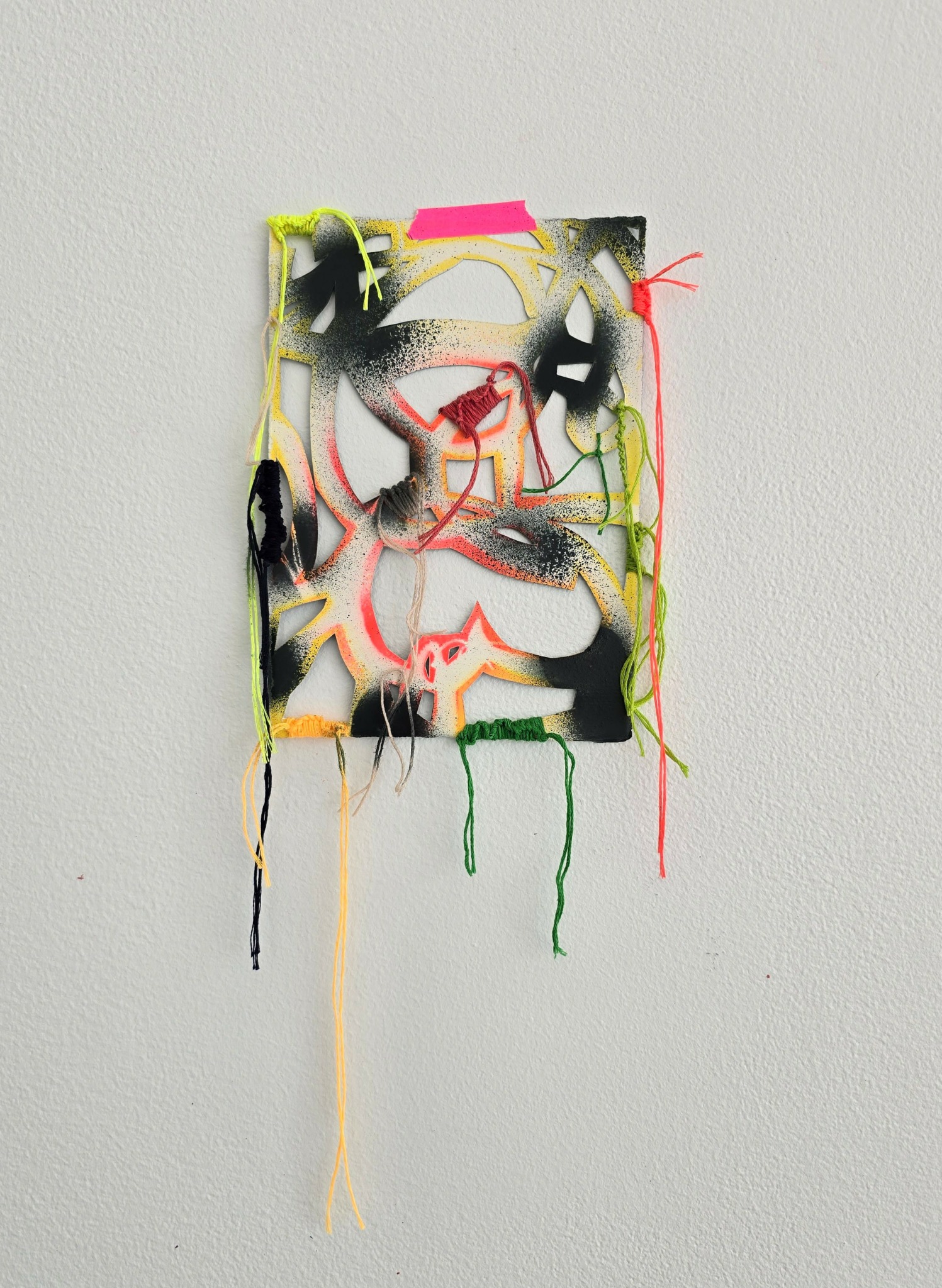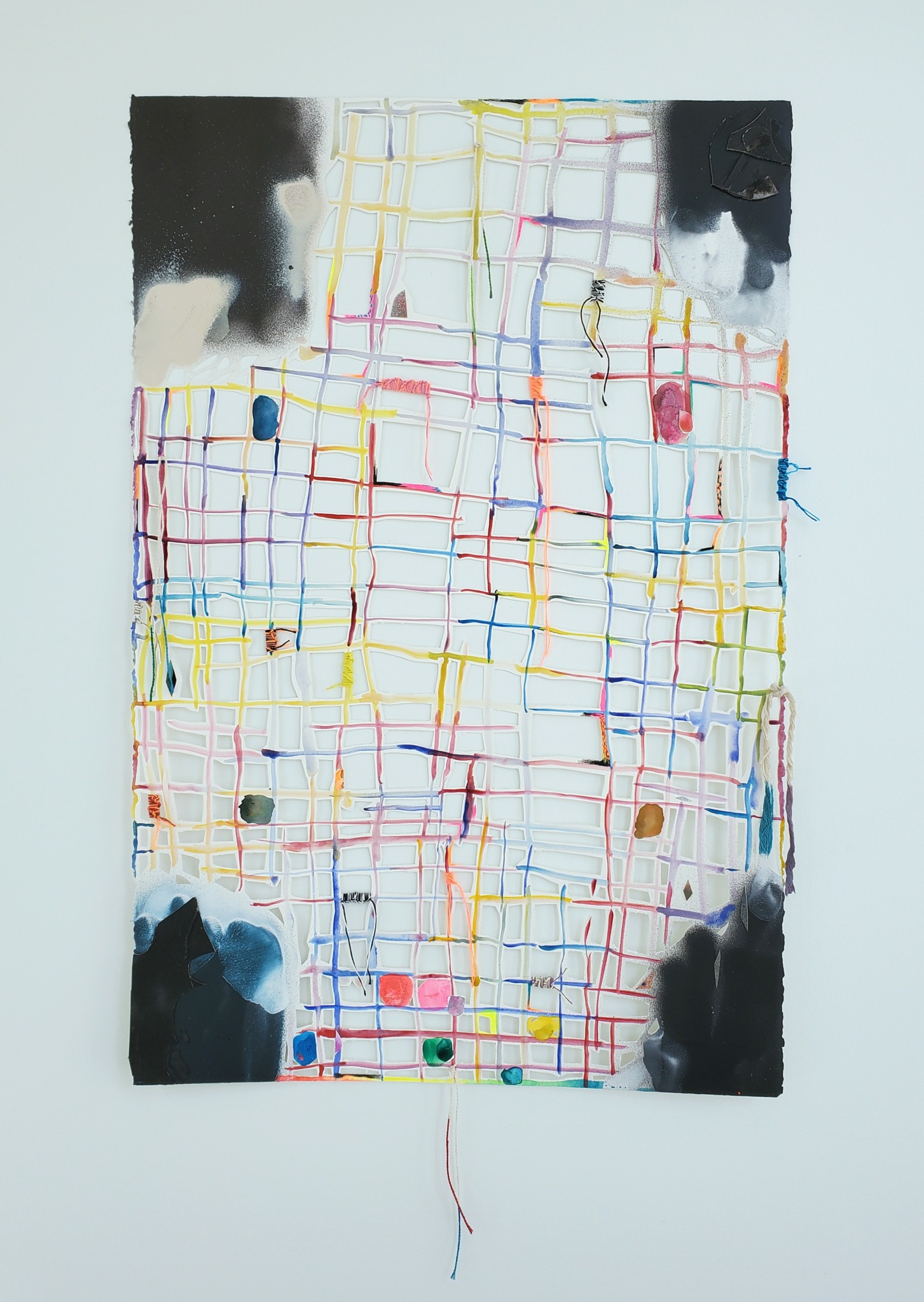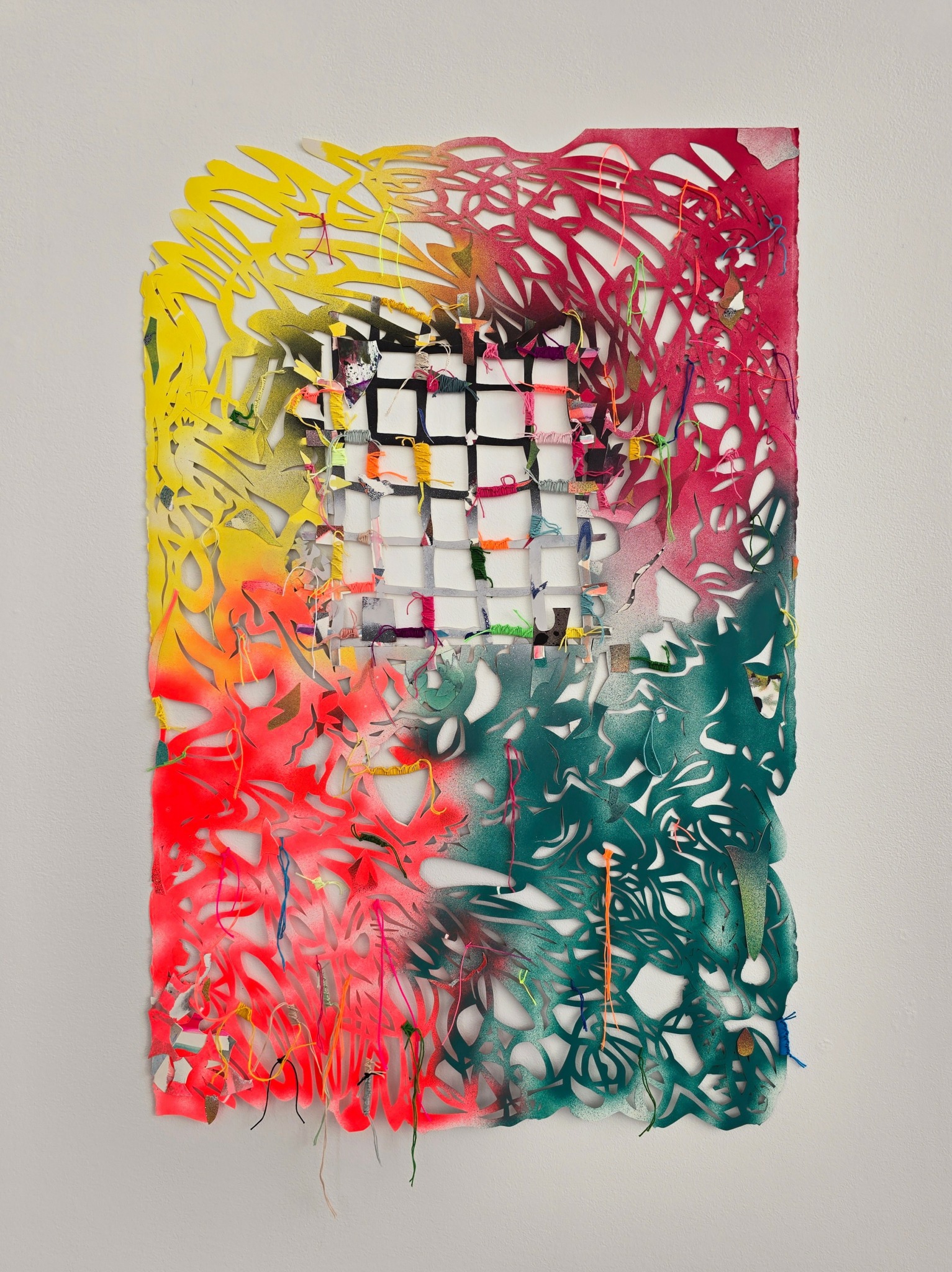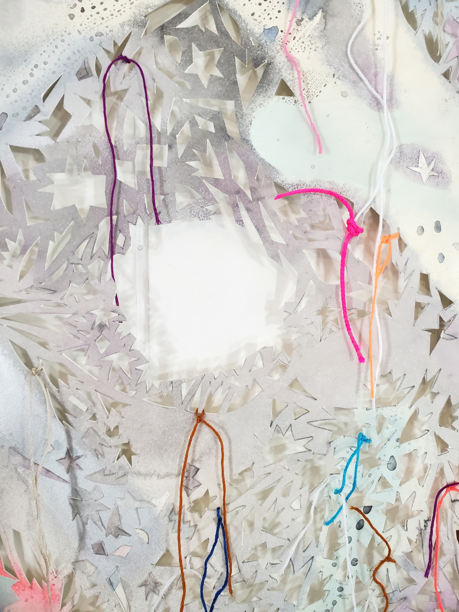 In my paintings, I pair additive mark-making with meticulous, subtractive cut outs. The cut outs are all hand cut and serve both an aesthetic and conceptual function. For instance, they can participate in the push/pull of color relationships and frame more intuitive gestures in my work, but they also challenge the preciousness of painting, particularly the notion that a painting is supposed to last indefinitely. I want my paintings to appear as if they are on the brink of falling apart. They incorporate holes, as well as bits and pieces of paper that hang off of the painting or fall to the floor. Elements of woven and knotted thread are used in the attempt to hold the painting together both literally and aesthetically.