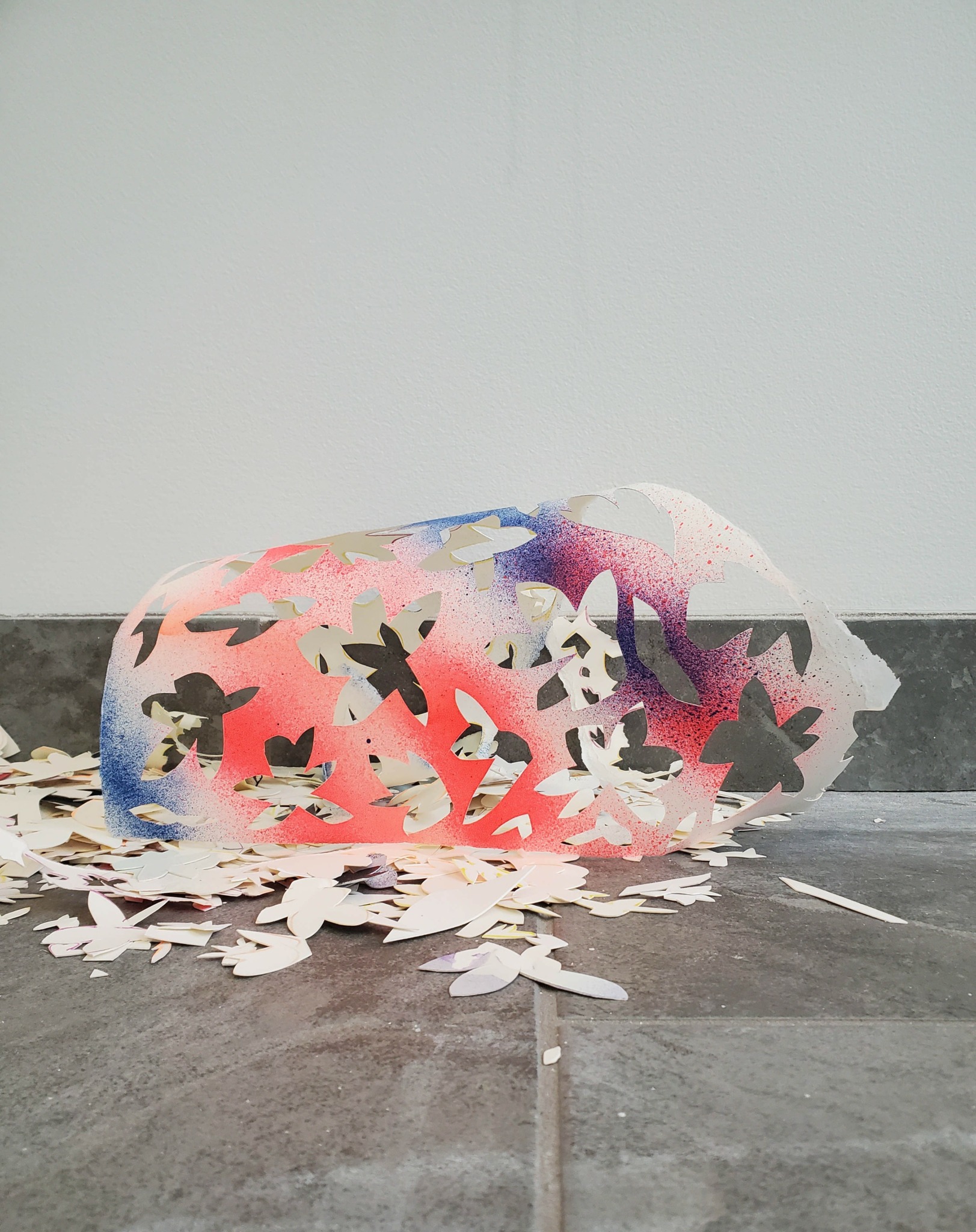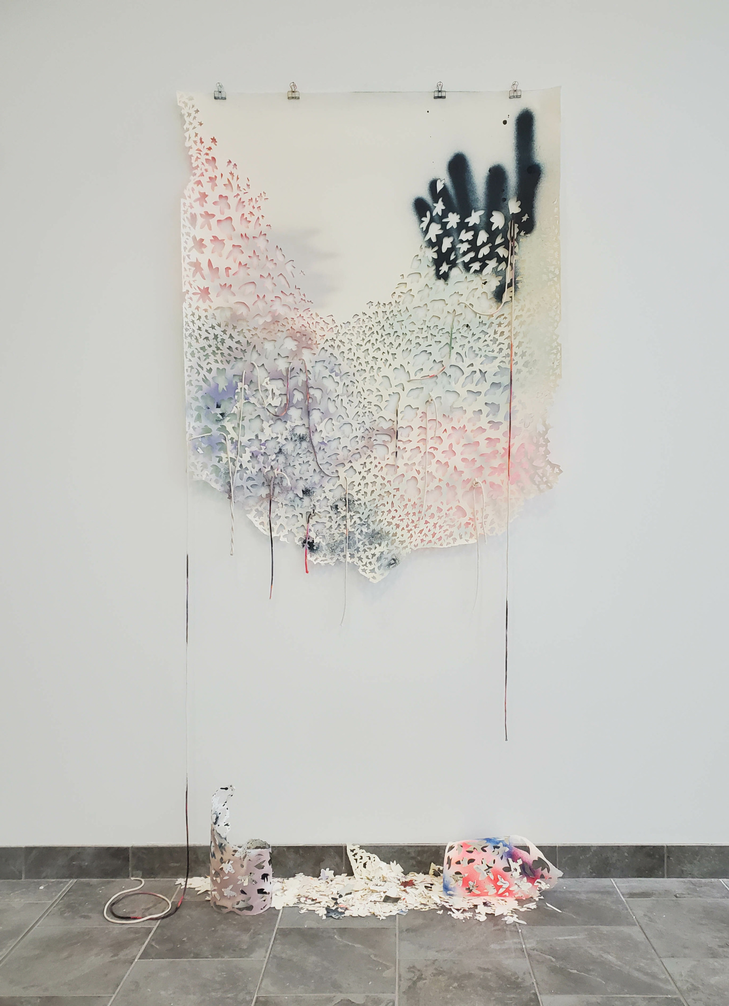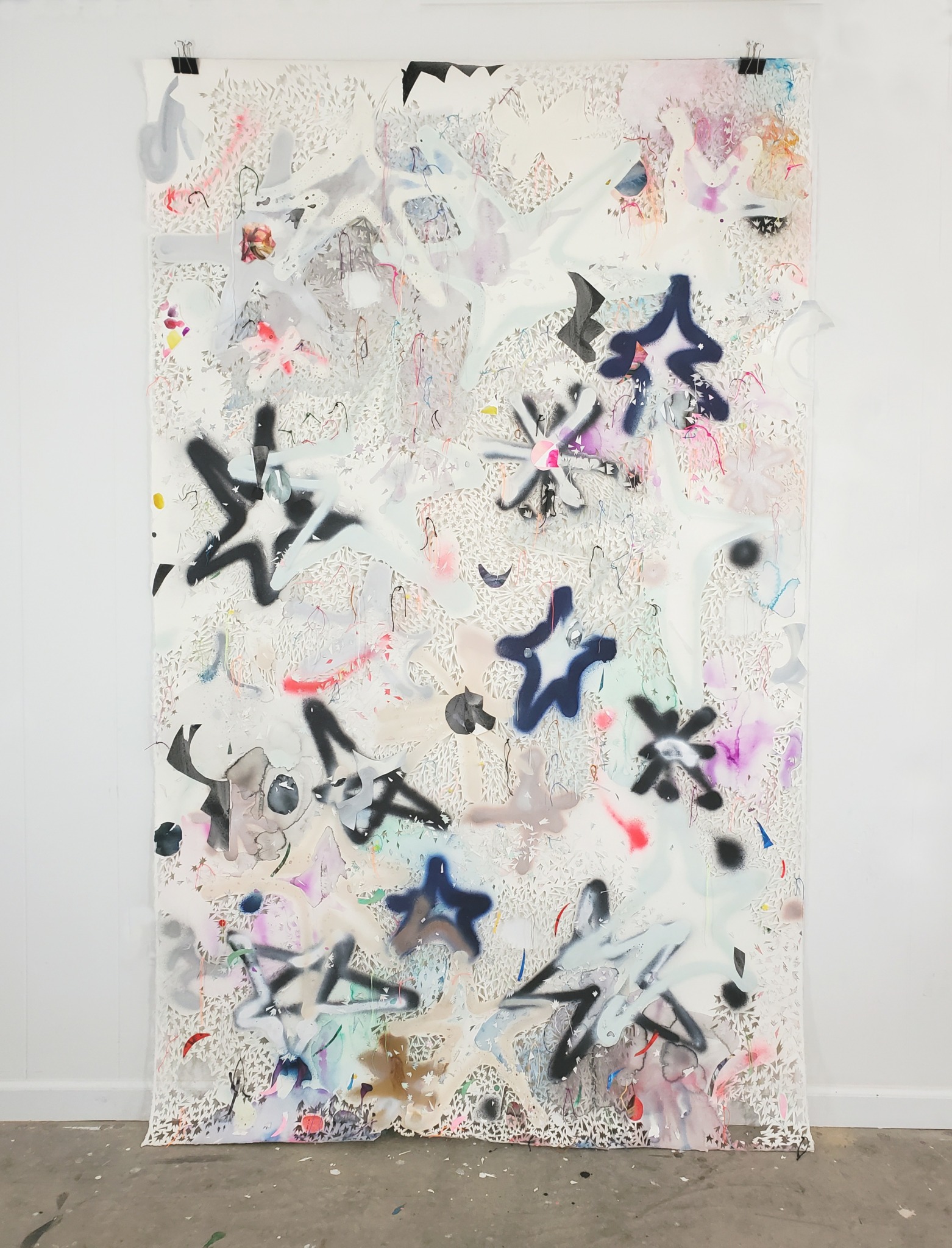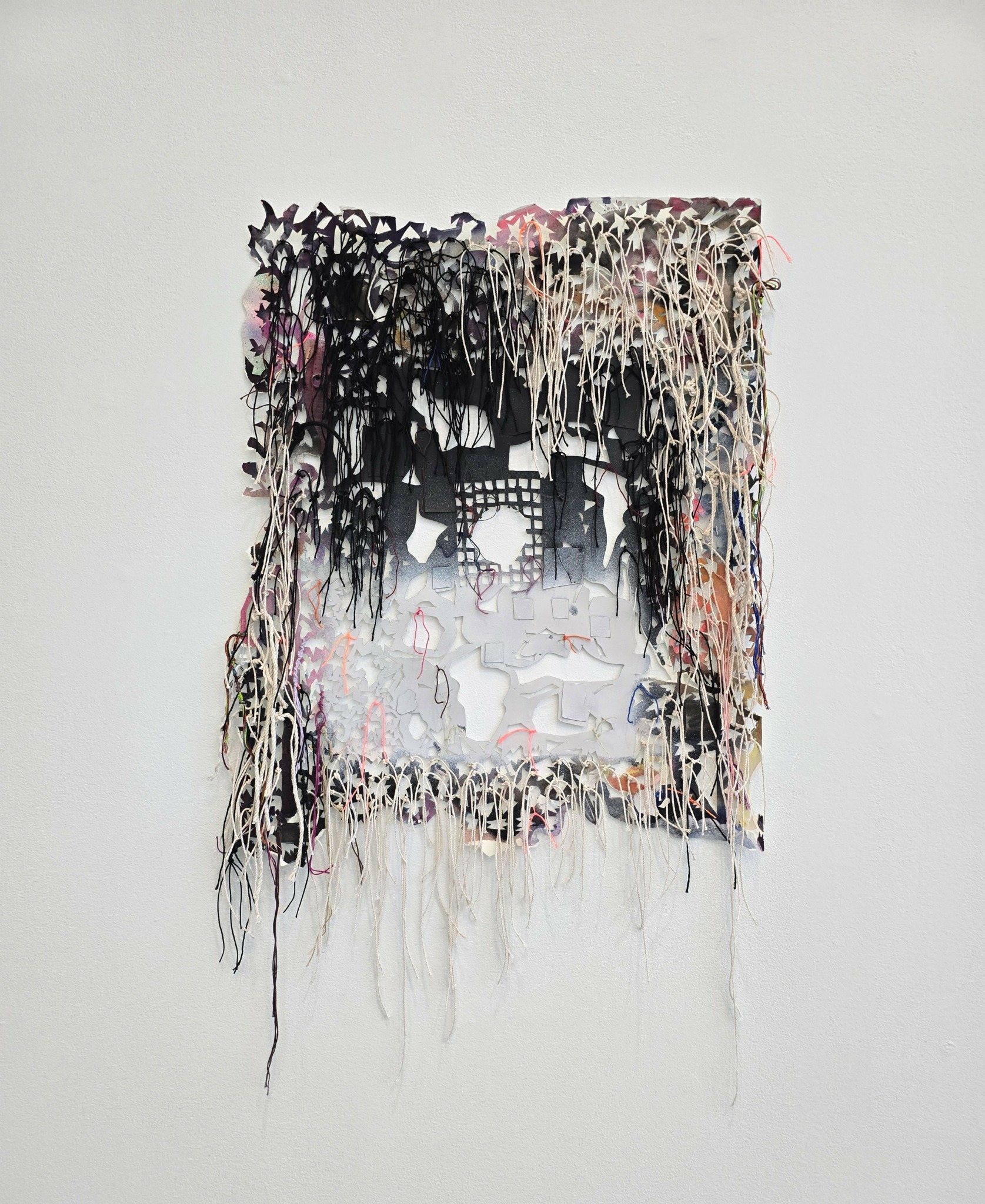 In my paintings, I pair additive mark-making with meticulous, subtractive cut outs. The cut outs are all hand cut and serve both an aesthetic and conceptual function. For instance, they can participate in the push/pull of color relationships and frame more intuitive gestures in my work, but they also challenge the preciousness of painting, particularly the notion that a painting is supposed to last indefinitely. I want my paintings to appear as if they are on the brink of falling apart. They incorporate holes, as well as bits and pieces of paper that hang off of the painting or fall to the floor. Elements of woven and knotted thread are used in the attempt to hold the painting together both literally and aesthetically.