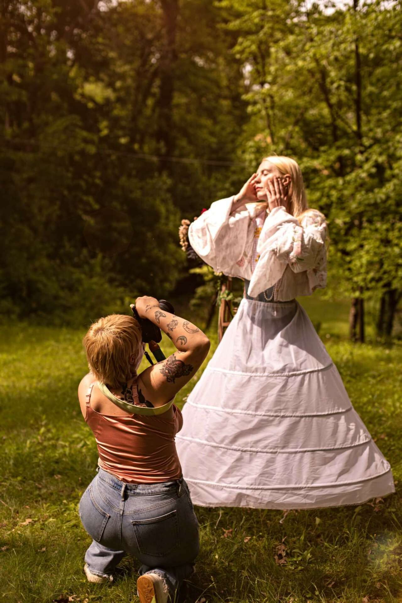 My business started with doing fun hair, makeup, and thrifted fashion looks and since has turned into a fully functioning business that allows me to travel to places like Arizona, Utah and Louisiana. I’ve been to creative content retreats with people I admire and learned with them and found such an amazing talented community of niche creative photographers that have definitely helped me find my style. My ideal session is definitely getting to style my client head to toe, and give them the space to step into the spotlight and glow as they should. I believe fiercely in self love and body neutrality. Our physical looks are just a way to express the bright colors of our soul. I love using props that give a sense of nostalgia. I love to create a scene and often get inspiration from films my spouse and I watch. My spouse and I have such a cosmic marriage and I am so thankful that they are part of my creative team and are supportive of my art. When I’m photographing weddings, B will often second shoot and charm any crowd my introverted self needs them too. Truly SUCH a blessing to my life and business. As queer people we offer a sense of community that not many other married photographers can. We had the disco wedding of our dreams last year after losing my grandma who raised me and my dad within two months of each other. Life is short. Learning this up close, letting the grief mold me as it should, also pushed me to make the art I’ve always wanted to make. My nan loved photos and had trunks of them for us to go through after she passed. The walls of my childhood home were lined with corny posed photos, that I still cherish to this day in a trunk of my own. Photos can capture so much about someone if you just know what moments to capture.
