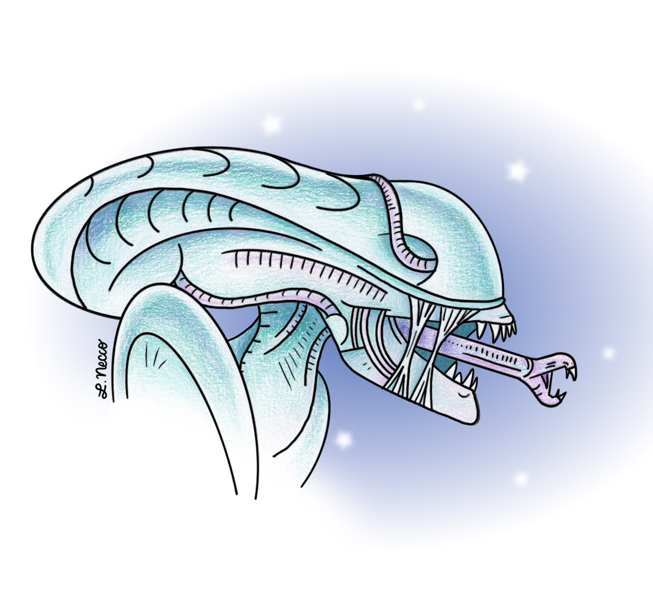 As I evolved, my art started leaning more toward the horror/sci-fi side of pop culture. I was using my skills with colored pencils to portray scenes and characters in horror movies. I liked the juxtaposition of using light and delicate colors paired with a darker subject matter. Naturally, this new style I was developing translated perfectly to mine and Toni’s business, Ghost Girl Greetings.