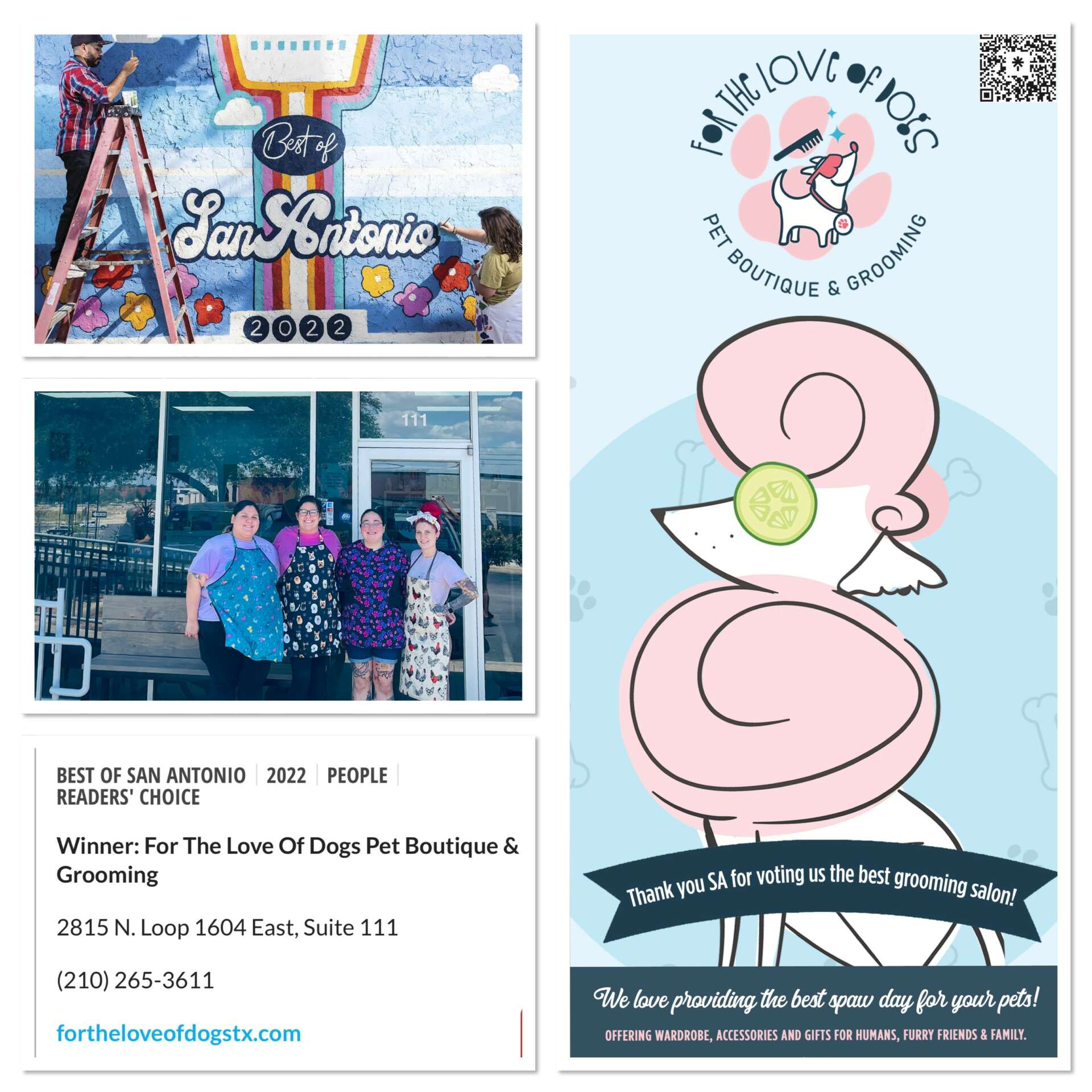For The Love of Dogs is a pet boutique and full service grooming salon in San Antonio, Texas. We offer creative grooming concepts with animal safe hair coloring as well as your pet’s everyday haircuts. Our storefront offers bandanas, dog treats, toys, human clothing, accessories, and much more! We’d love for you and your fur family members to be a part of our pack!