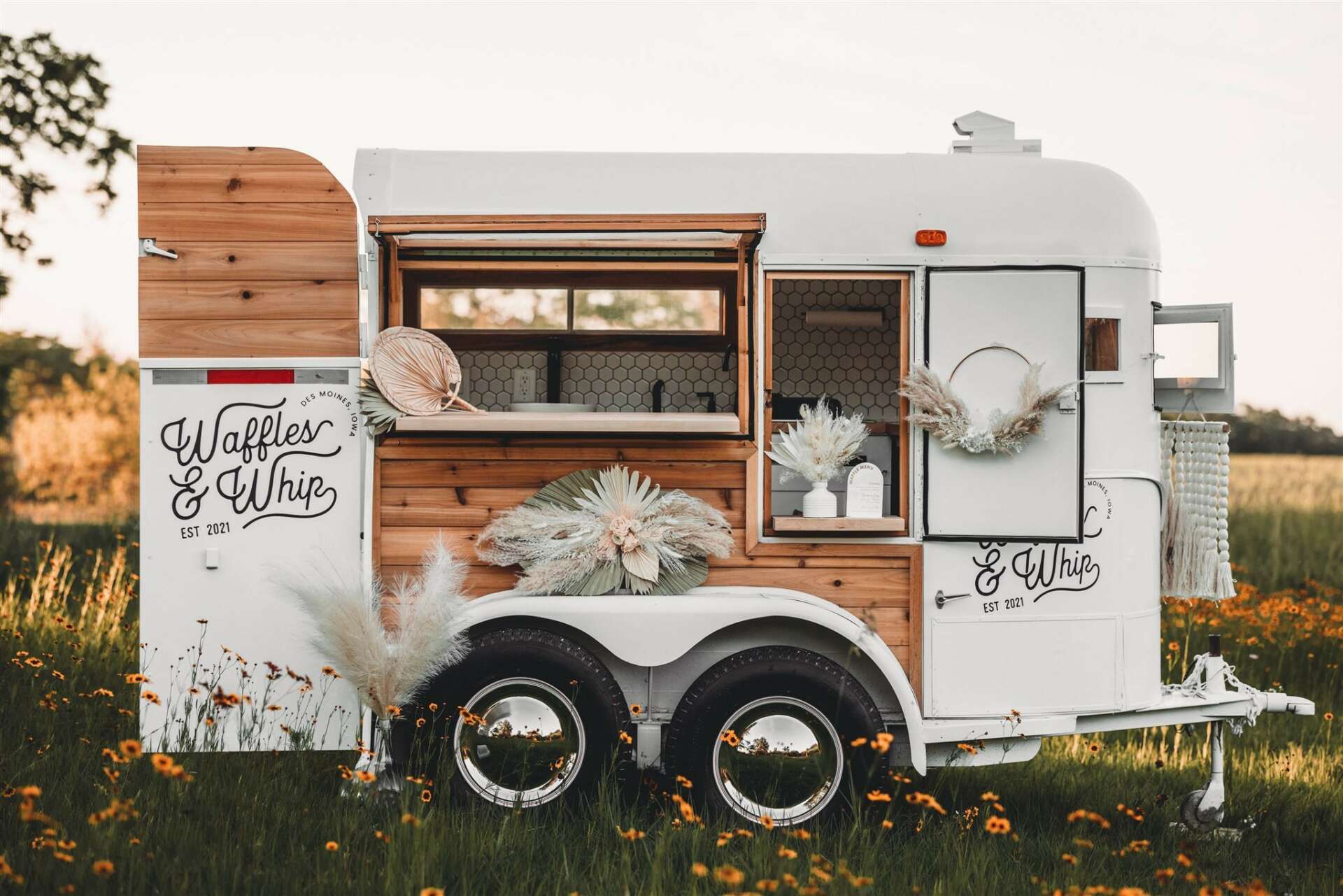 I’ve been an entrepreneur going on 8 years. I started back in 2016 a custom airbrush tanning business “Bronze515.” After covid in the Fall of 2020 I really wanted more. I wanted something completely different than what I was doing. I kept seeing these cute horse trailers people were converting into mobile bars and I thought, I could do that. Instead though let’s not make it a bar but let’s make it a mobile waffle bar and serve dough based liege waffles out of it that are on a stick. My last name is also “wafful’ so it was a very easy “yes.” I found a 1980 horse trailer in Nebraska City, Nebraska and we drove 4 hours one way to pick it up. I had a friend of mine (Ryan Ballman, Red Maple Renovations) convert it into a dream of mine. I knew instantly that my idea would be a hit. We had our first paid event in August of 2021 and operate seasonally late spring-end of October with the trailer. Iowa winter are harsh and the trailer has no heat so while I would love to operate year round, it makes the most sense to just have it out during those months. We focus specifically on private/pre-paid events. A lot of graduation parties, corporate events, weddings, bridal showers, etc. Our business model is very different than what you would see out of a typical food truck. I wanted to be strategic in how we operated. I know a lot of food trucks go to farmers markets, art festivals, etc but those are a guessing game and I think you can either win big or lose when you go to those and I didn’t want to lose. Waffles & Whip is also a side hustle to my full-time job of own a custom airbrush tanning salon. I think I would probably take more events and do more if I didn’t have another business. Waffles was intended to be something I could do on the weekends with friends and family helping out. Our horse trailer is tiny. About 4 feet to move around! We have a 100 pound waffle iron imported from Belgium that we use that makes 4 waffles at a time. We keep our private events to less than 200 usually but have said yes this upcoming year a little bigger events now that we have two waffles irons!