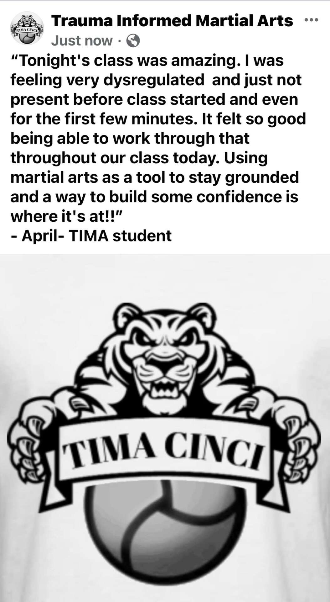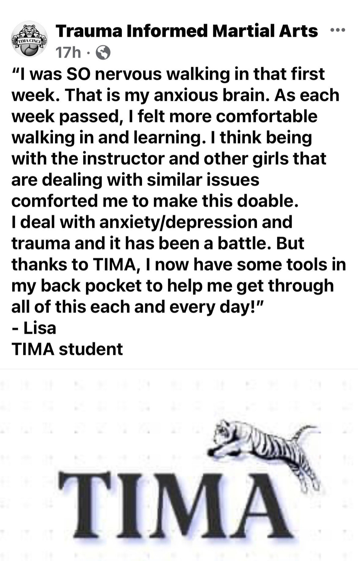 I’m happy to say I have heard so many stories about how Trauma Informed Martial Arts (TIMA) has played a positive role in people’s lives. One that has really touched me is a story of a woman who came to class not being able to walk outside alone. I was not aware of this at the time she started the class. She had even signed up for class with a friend and they always came together. Then one day she ended up being the only student there with me and she shared how TIMA had helped her step outside of her comfort zone and she couldn’t believe she had come to class alone. She said that TIMA helped her feel comfortable and confident enough that she could now walk outside alone again. I was blown away!