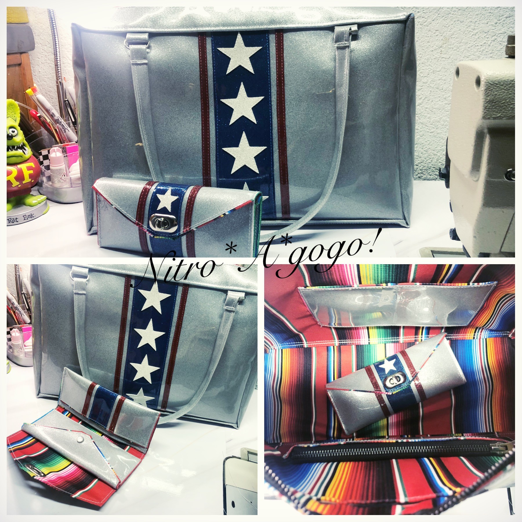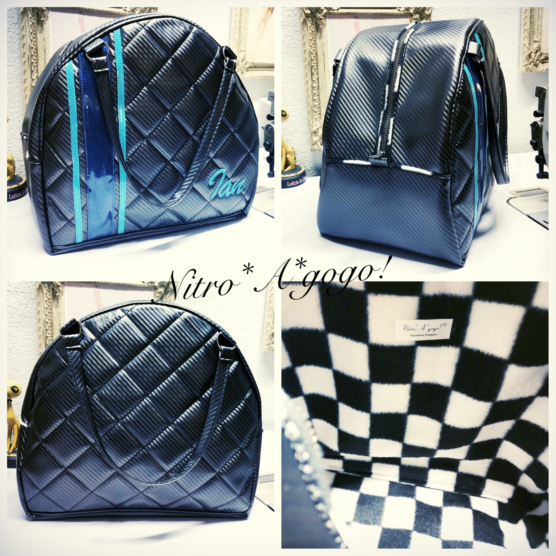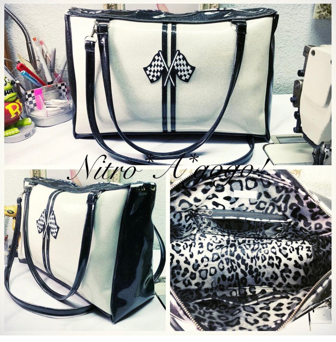 The name of my brand Nitro*A*gogo! came from my love of vintage 60’s & 70’s fashion.. particularly knee boots, hot pants, mini skirts & big giant black sunglasses. The GoGo dancer look & street style. The Nitro part comes from my Husband Jeff. He is a profession drag racer. We race Nitro Funny Cars. My bags & accessories all started our being made from metalflake car upholstery vinyls & faux furs. Very 60’s style.