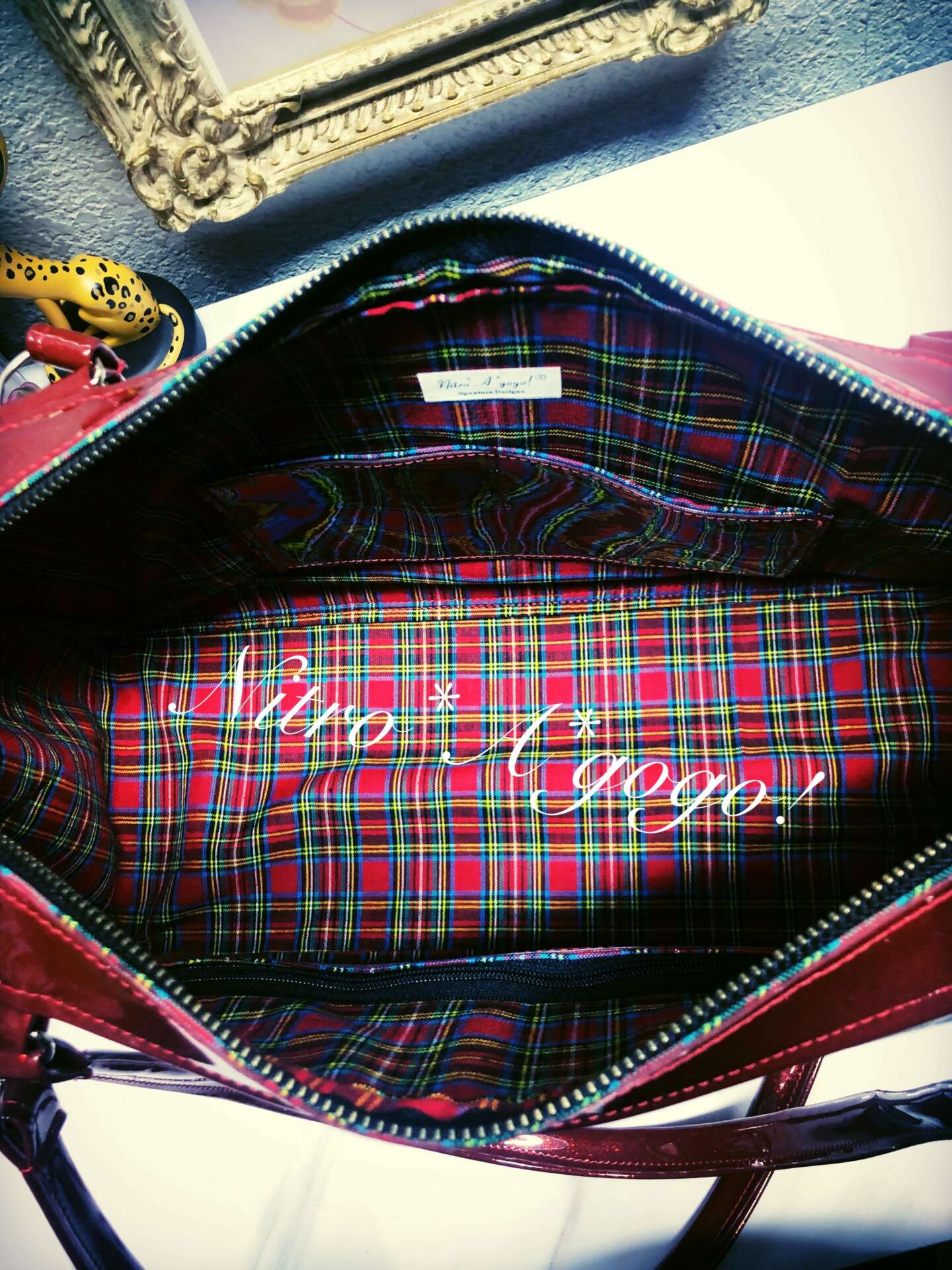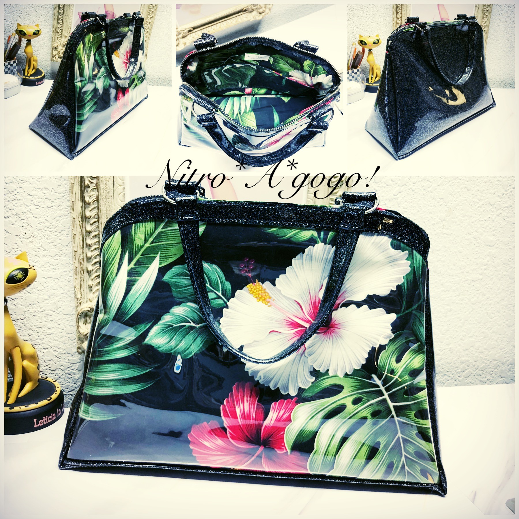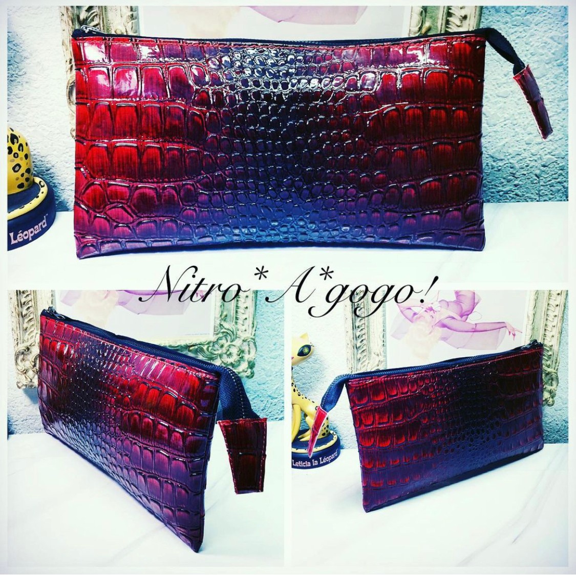The name of my brand Nitro*A*gogo! came from my love of vintage 60’s & 70’s fashion.. particularly knee boots, hot pants, mini skirts & big giant black sunglasses. The GoGo dancer look & street style. The Nitro part comes from my Husband Jeff. He is a profession drag racer. We race Nitro Funny Cars. My bags & accessories all started our being made from metalflake car upholstery vinyls & faux furs. Very 60’s style.