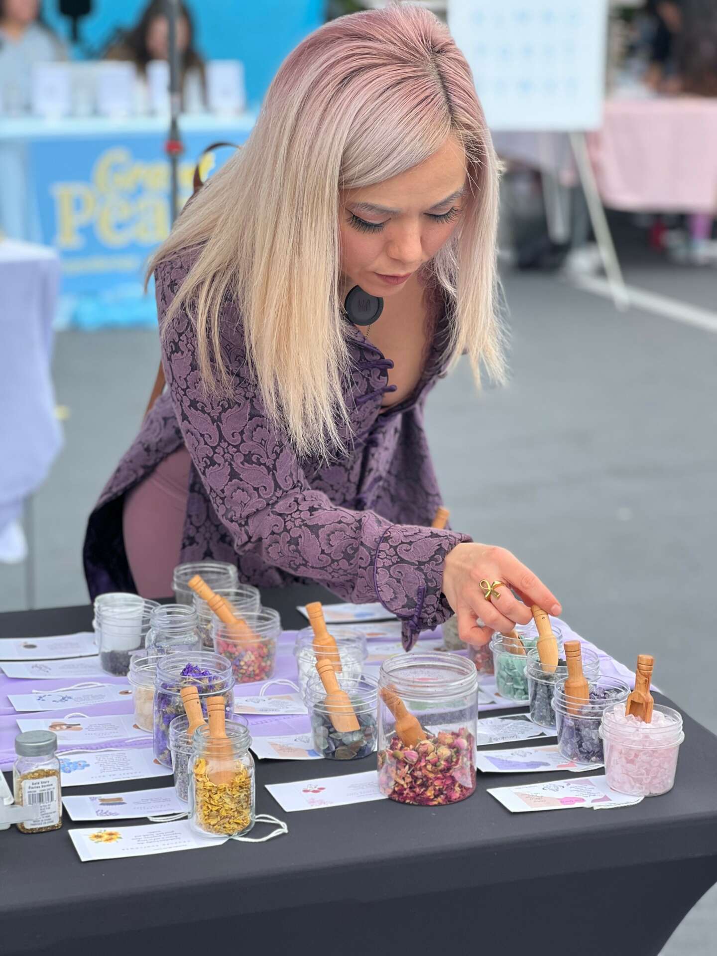 Well this is when I started my Intention Candle business, In 2019 I started to make candles with crystals and herbs, stones, elements that corresponded to the intention. I started with my friends and family and slowly made my way to Etsy and Instagram. I wanted to help people heal, I wanted to show the world we do not need drugs like Zoloft to heal us,. There is a great support of people in the spiritual community that can help you find your place, once we understand death or loss, pain and anger, all feelings are valid but its how we come out of hard situations that can make or break us. By setting your intention in your candle, believing and affirming you can move mountains. in 2021 I started doing Pop Up events all throughout Southern California. When I first started my business I only started with 4 intentions, now I have over 13 intentions. In 2022 I decided to do something very different, something that nobody was doing, I decided to bring to the pop up events my famous “do your own intention candle” This is an opportunity for customers to design their own intention candle, set their intention. They choose from different candles already made, different intentions. After they choose their intention they get to design it at the event. They choose their own stones/crystals, herbs, charms. They put it together with me. Its a super fun interactive way of building a relationship with my customer and letting them set their own intention. It is fun for all ages, for everybody.