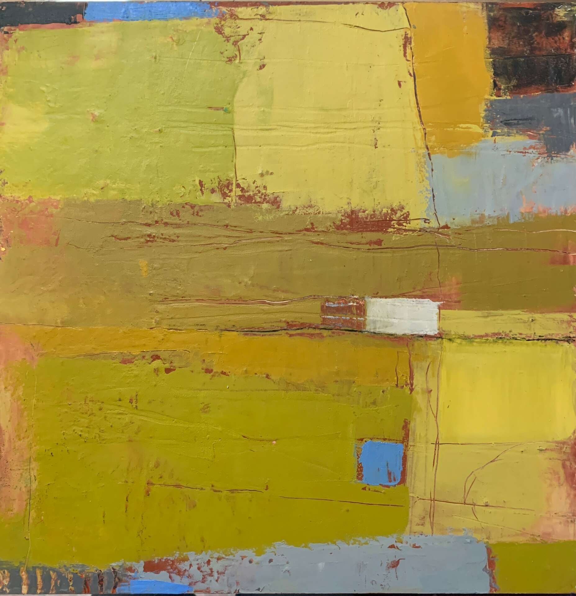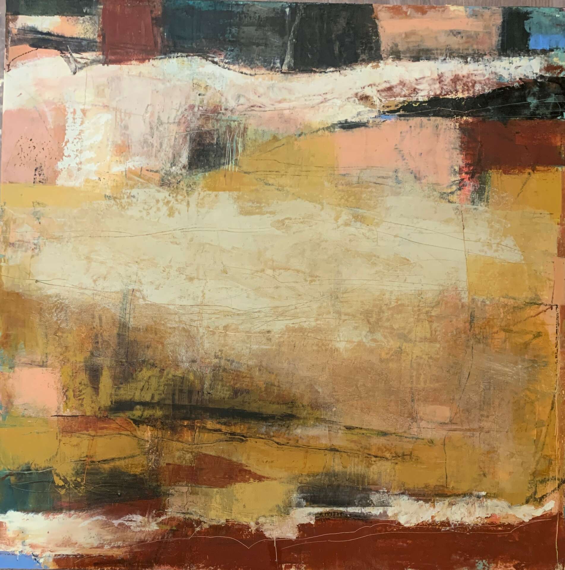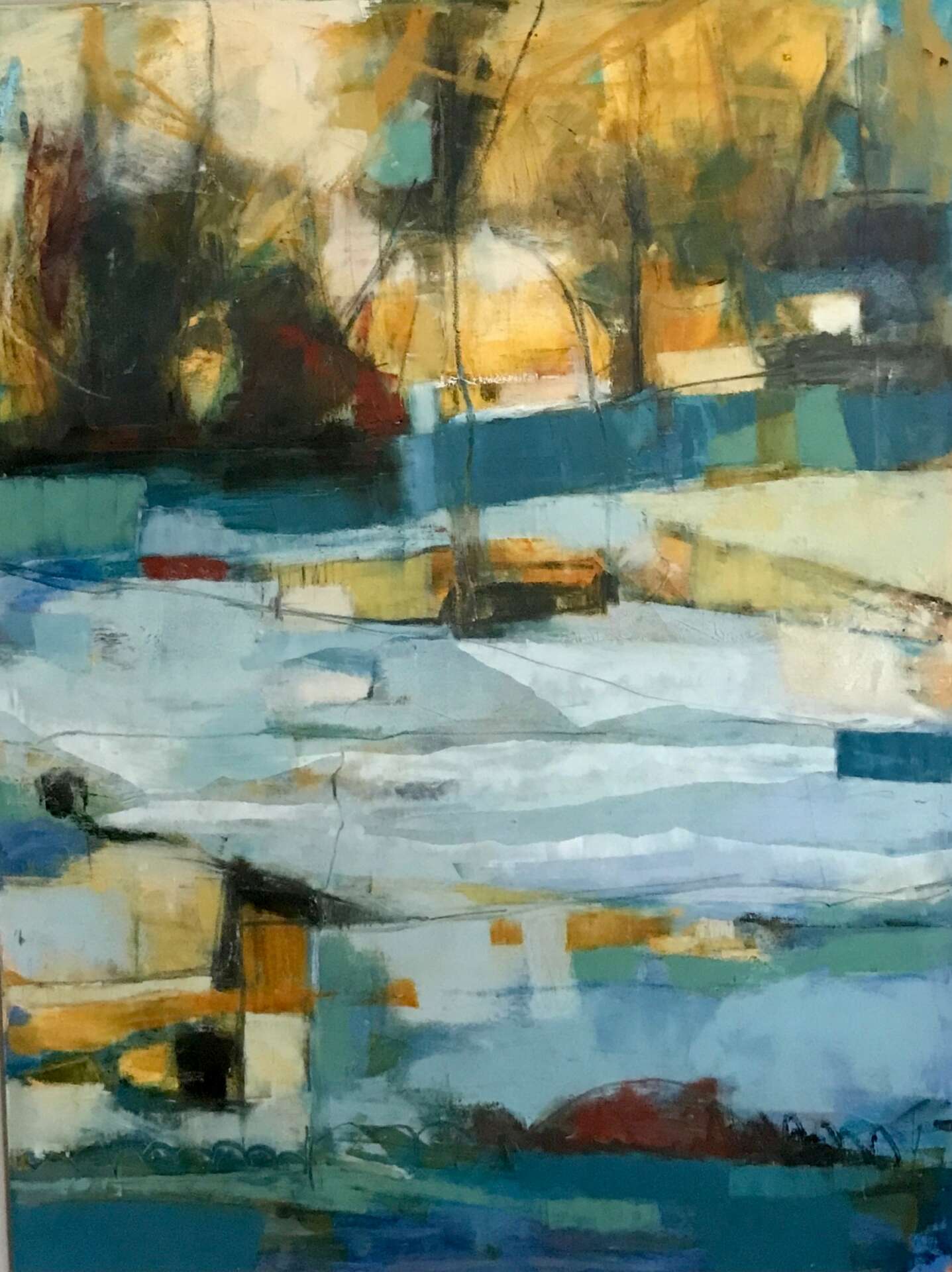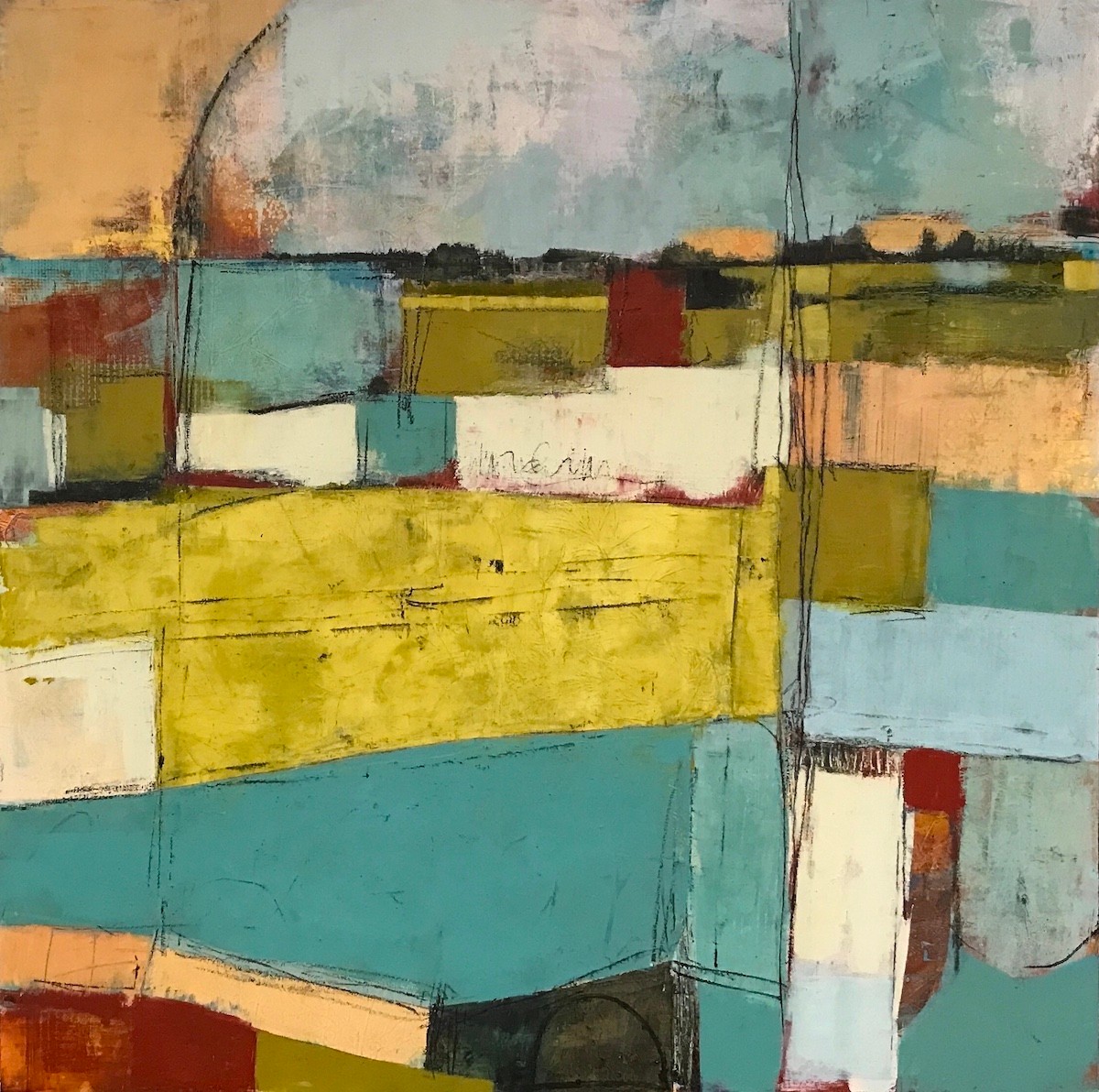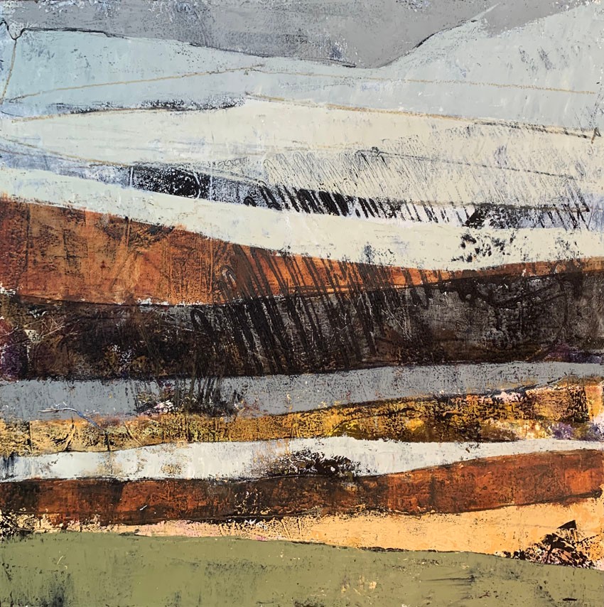 Having been in the field of arts education I create using many different visual art mediums including acrylic painting, oil painting, printmaking, collaging, drawing, bookmaking and more. Currently, my primary focus is working with oil paint and cold wax. The wax is added to the oil paint to create a frosting like consistency that can be texturized, scraped into, layered, and used as a glaze. The completed paintings have a wonderful matte finish due to the wax component. Working with oil and cold wax is a unique approach where many layers of transparent and opaque colors are used creating a sense of history in the painting. My paintings are based on abstracted, simplified landscapes where I create a sense of place for the viewer to reside. I am inspired by the shapes, colors, lines, and textures in nature and I strive to express the essence of the scene in my paintings. I work primarily on cradled birch panel board in sizes ranging from small to large. When completing a commissioned artwork, I work with the client to understand what their desires and needs are and how the painting will fit into their space. It is gratifying when someone purchases one of my paintings and brings it into their home or office space to enjoy. I have sold pieces to medical facilities and I always hope that my work will aid in a positive, healing atmosphere of the facility.