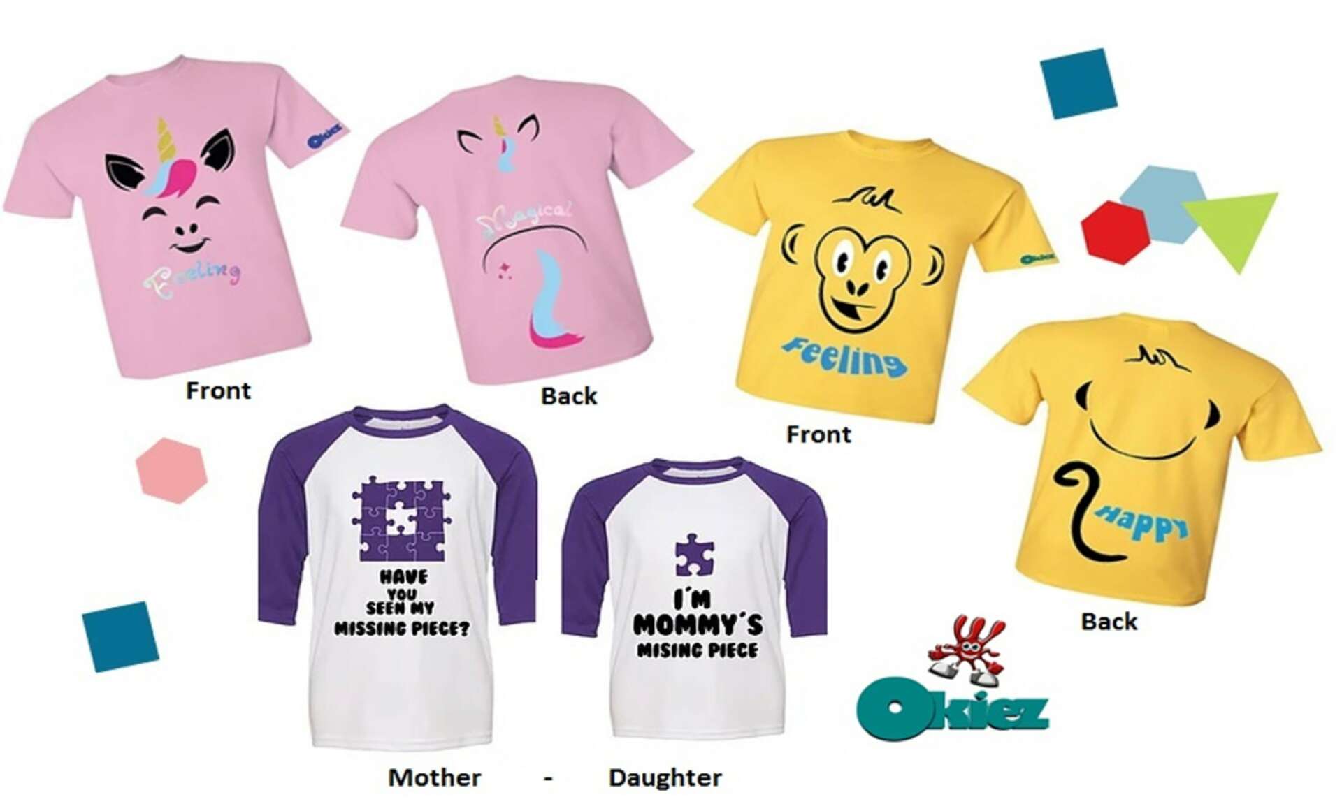 Okiez t-shirts: These have designs that help children easily know the front from the back and are designed with graphics that encourage children to express their feelings.