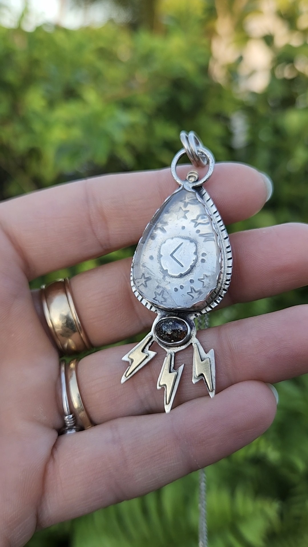 Finding freedom in expressing my creativity has been key to my growth as a person. Creating art and jewelry for myself, and then feeling confident enough and offering these works to my fellow people has been a reward in itself. Loving my own works thru their evolutions has been a hard step to take. I want my jewelry to be loved by others as much as I love it, and I pride myself on creating that kind of energy in the world when others find their own personal power when wearing my talismans.
