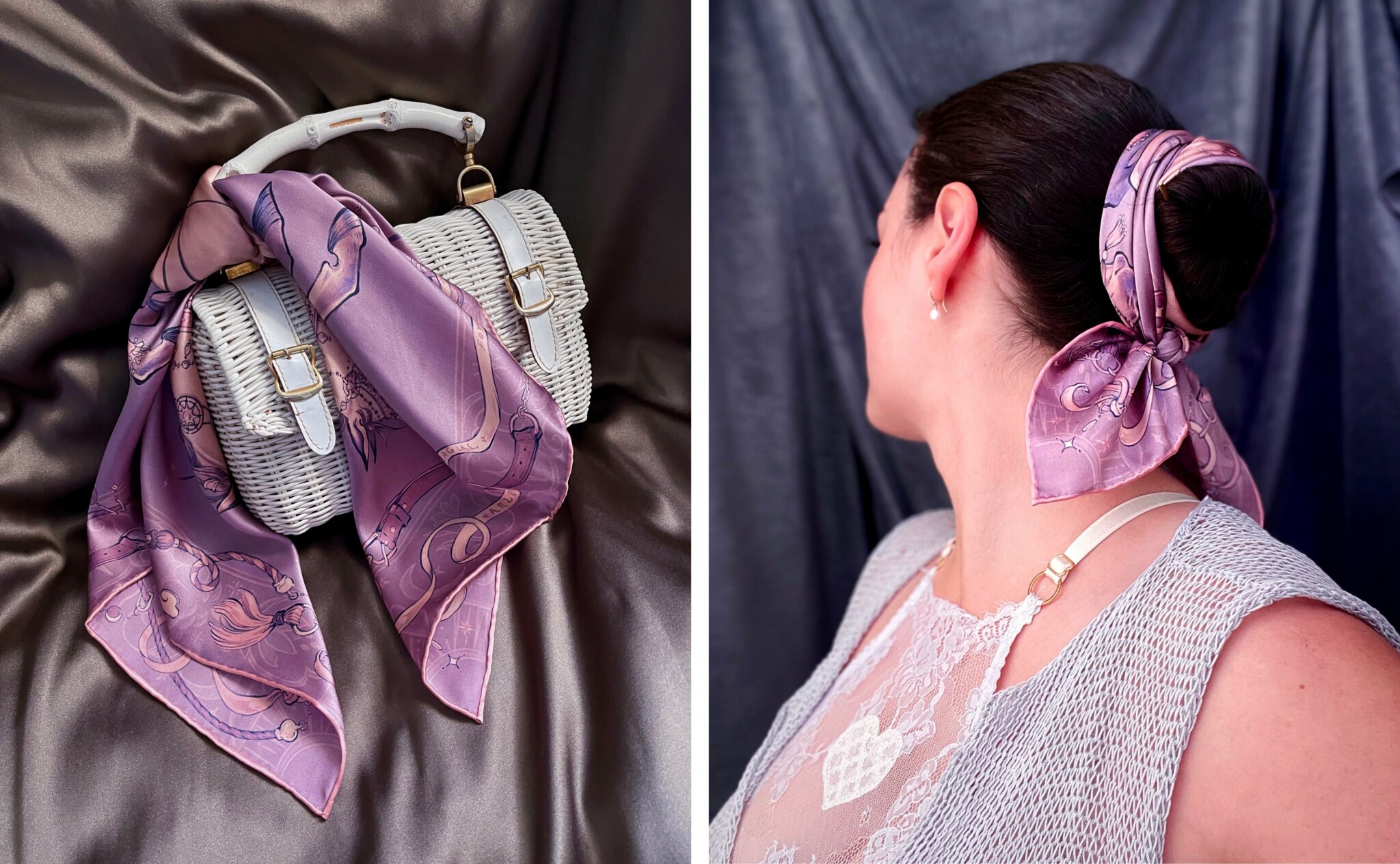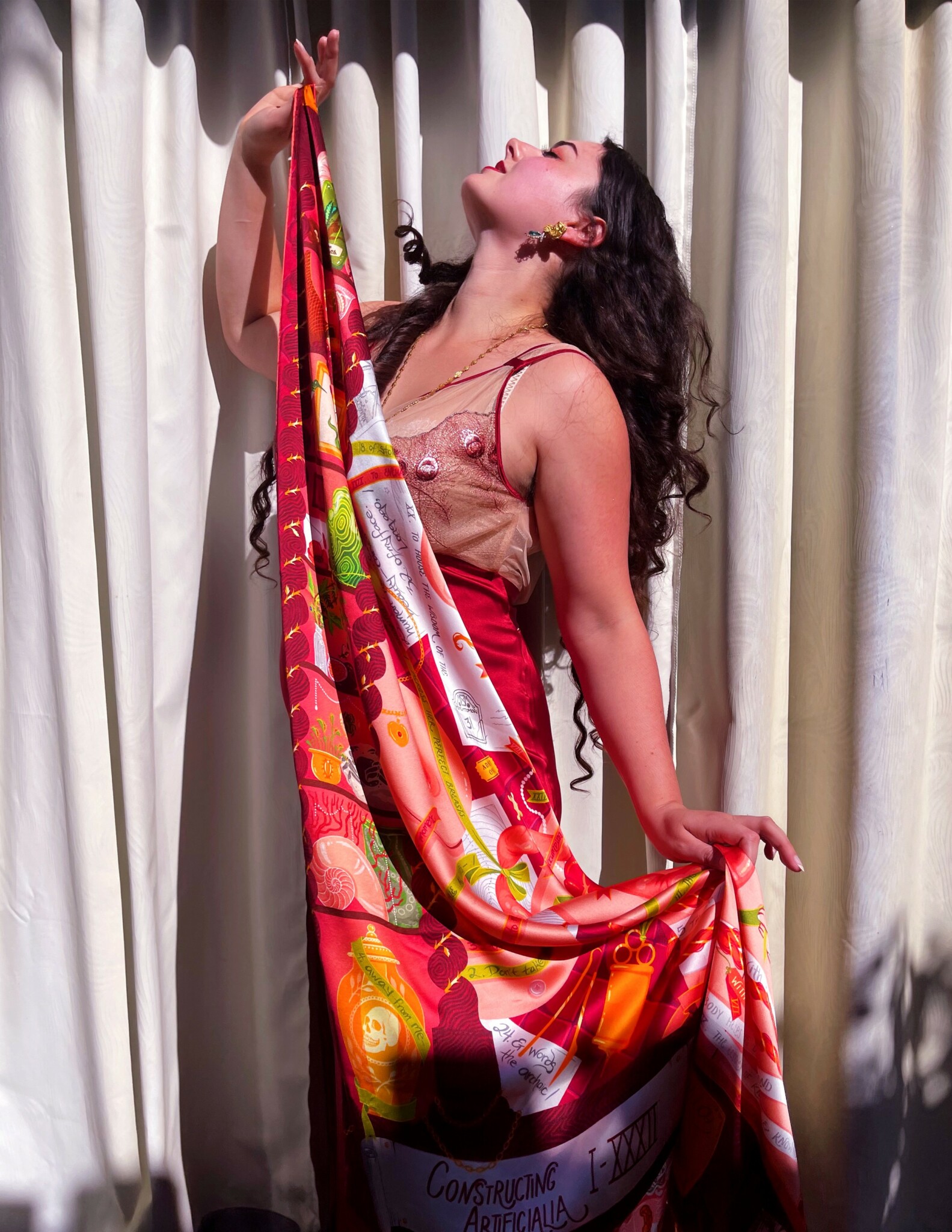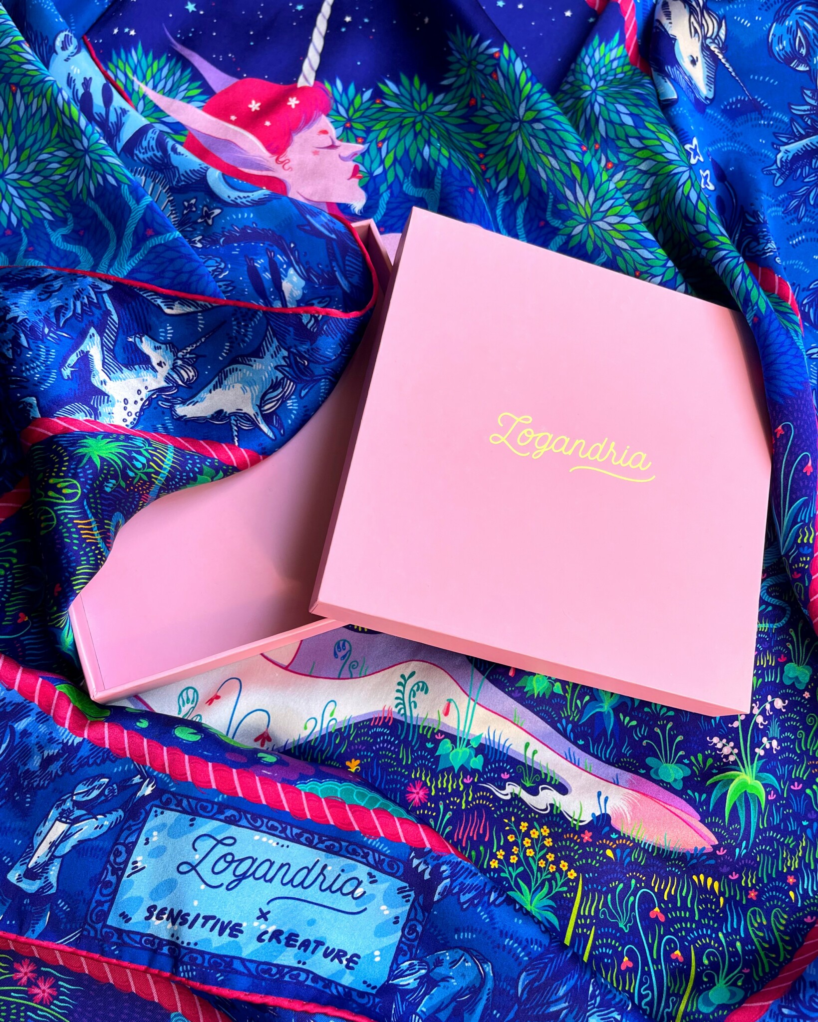 I’m an illustrator and scarf designer, and I run a small luxury silk scarf brand under the name of Logandria. Each silk scarf has a narrative or symbolic theme, often related to art history, mythology, fantasy, queerness, or the natural world. Many (though not all) of my scarves are explicitly erotic – though, when worn, erotic details are often reduced to an abstraction of line and color.