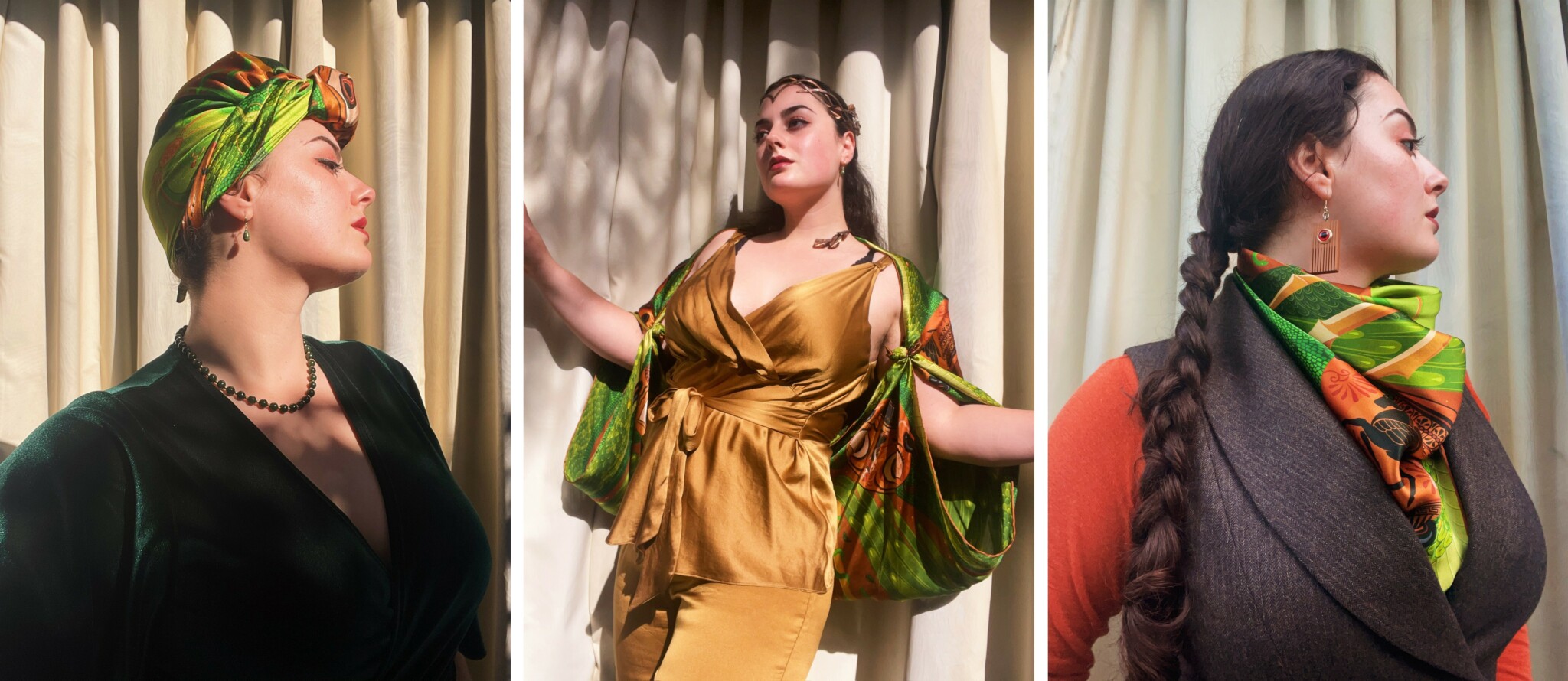 My goal with each scarf is not only to create a beautiful illustration that looks great on a screen or on paper, but to create something that looks utterly incredible when worn. Detail, composition, and color scheme are all carefully considered from the wearer’s point of view, and the result is a beautiful and highly detailed piece of wearable art that looks fantastic from every angle and changes each time the scarf is tied.