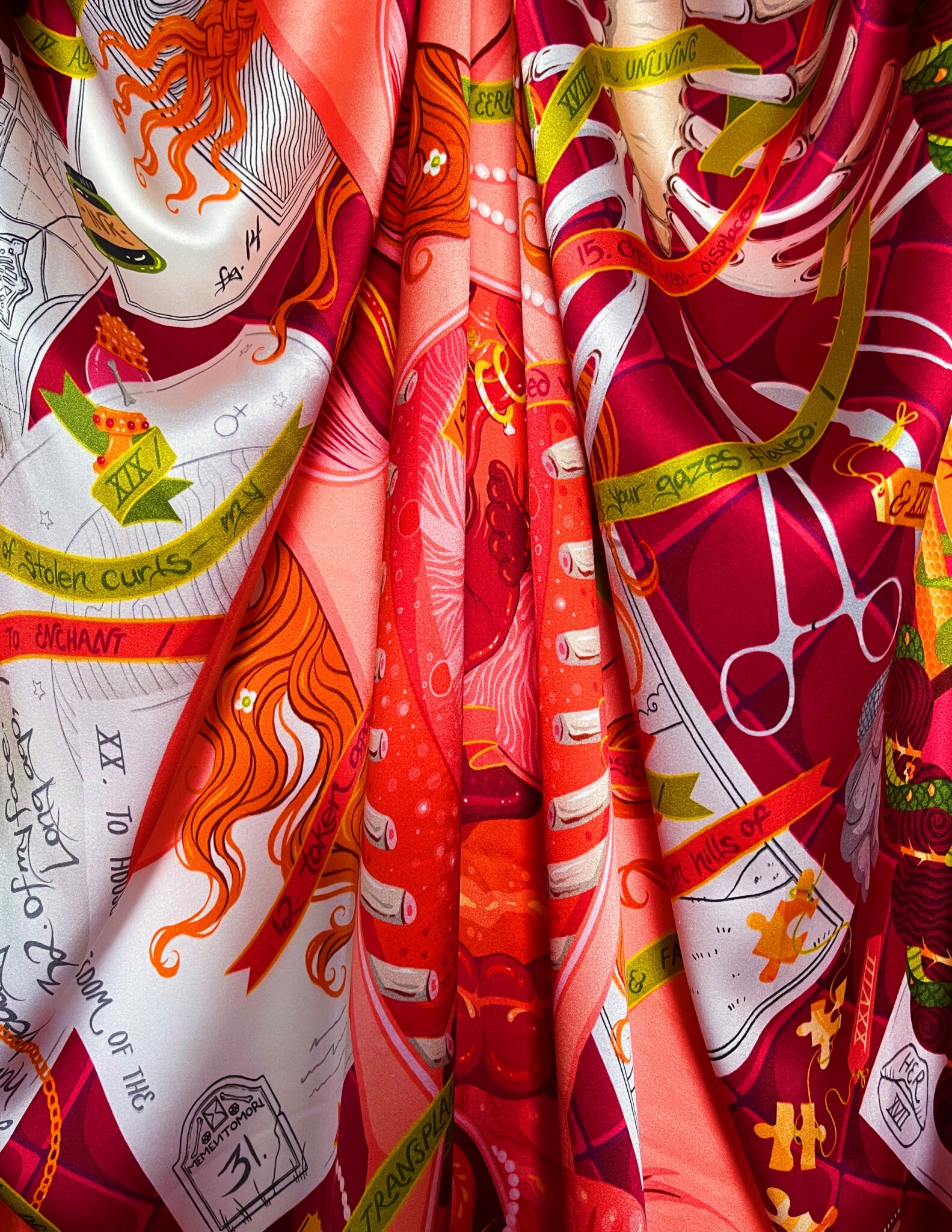 While the majority of my scarves are my own work, I also collaborate with Guest Artists to create scarves. These projects vary from single-artist commissioned works, to conceptual collaborations where both of us plan a piece that I then illustrate, to much more involved collaborations where both of us work together to conceptualize the piece as a whole and illustrate different sections. To date, I’ve worked with Lee Woolhiser, Cora Harrington, Danielle Roberts, Marlowe Lune, Fyodor Pavlov, and Arlo Teague, with more collaborations in the works.