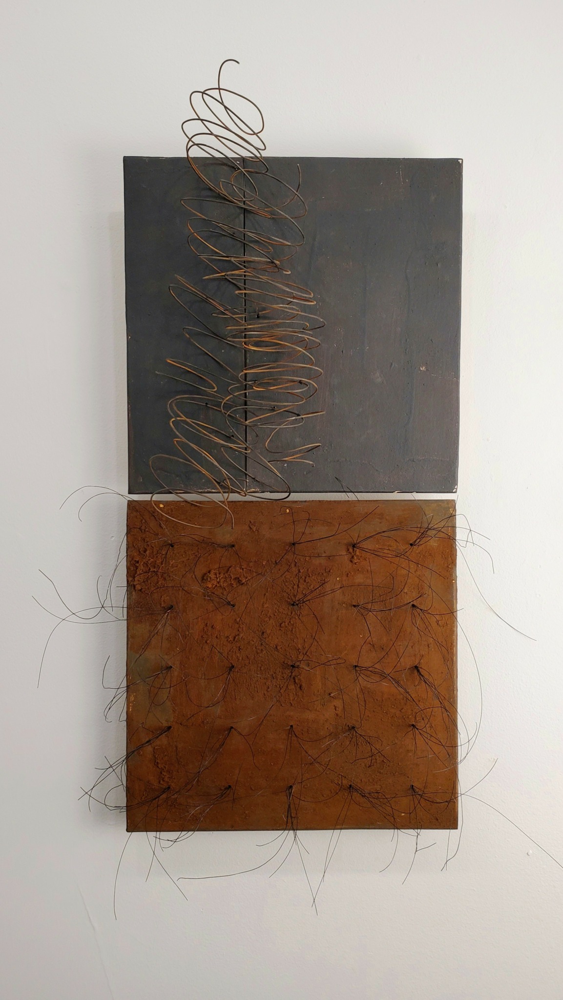 My current body of work involves the play of dark against light, the pull of empty space against the inclination to fill it up, the placement of line and mark, balance. My pieces are a visual and tactile exploration of my medium and have begun to include some elements of mixed-media, mostly wire.