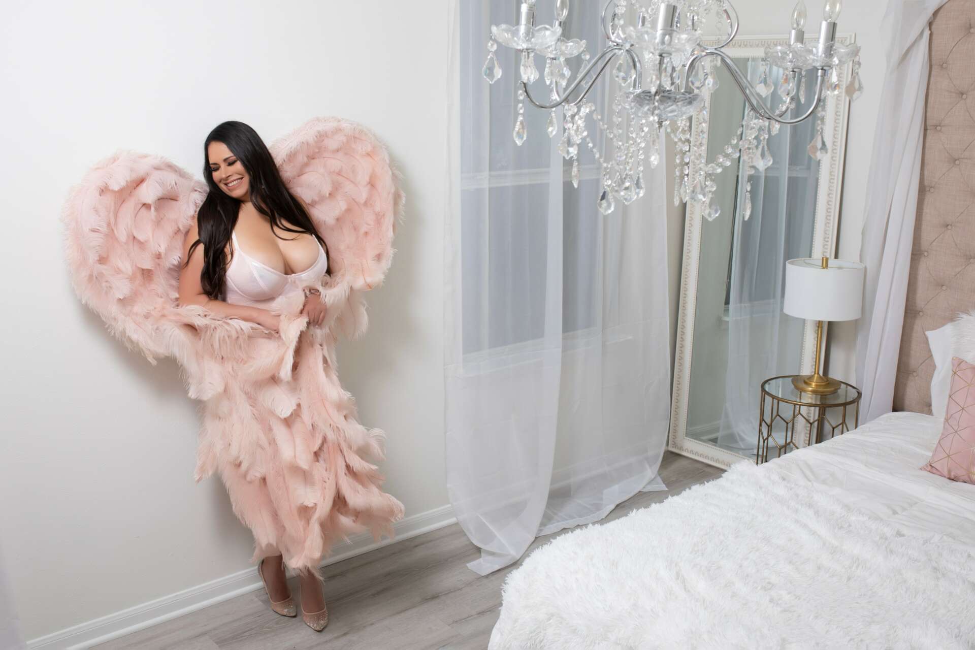 The day of your session is… well it is FUN! It is like a girls day with our (all female) team. And we love to pamper you. We will have different outfits pulled from our Lux Closet for you. We will have your heels picked out – we even provide red bottom heels! We have other options for you as well, like the angel wings and Hollywood robes.