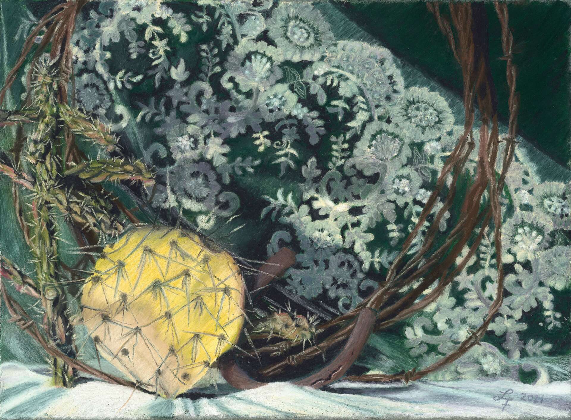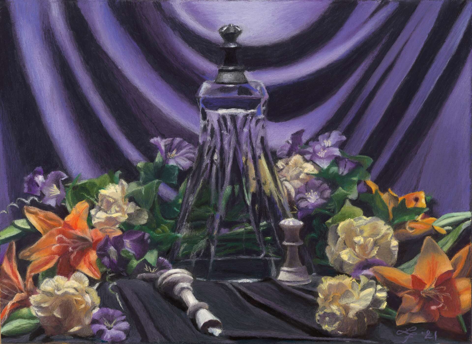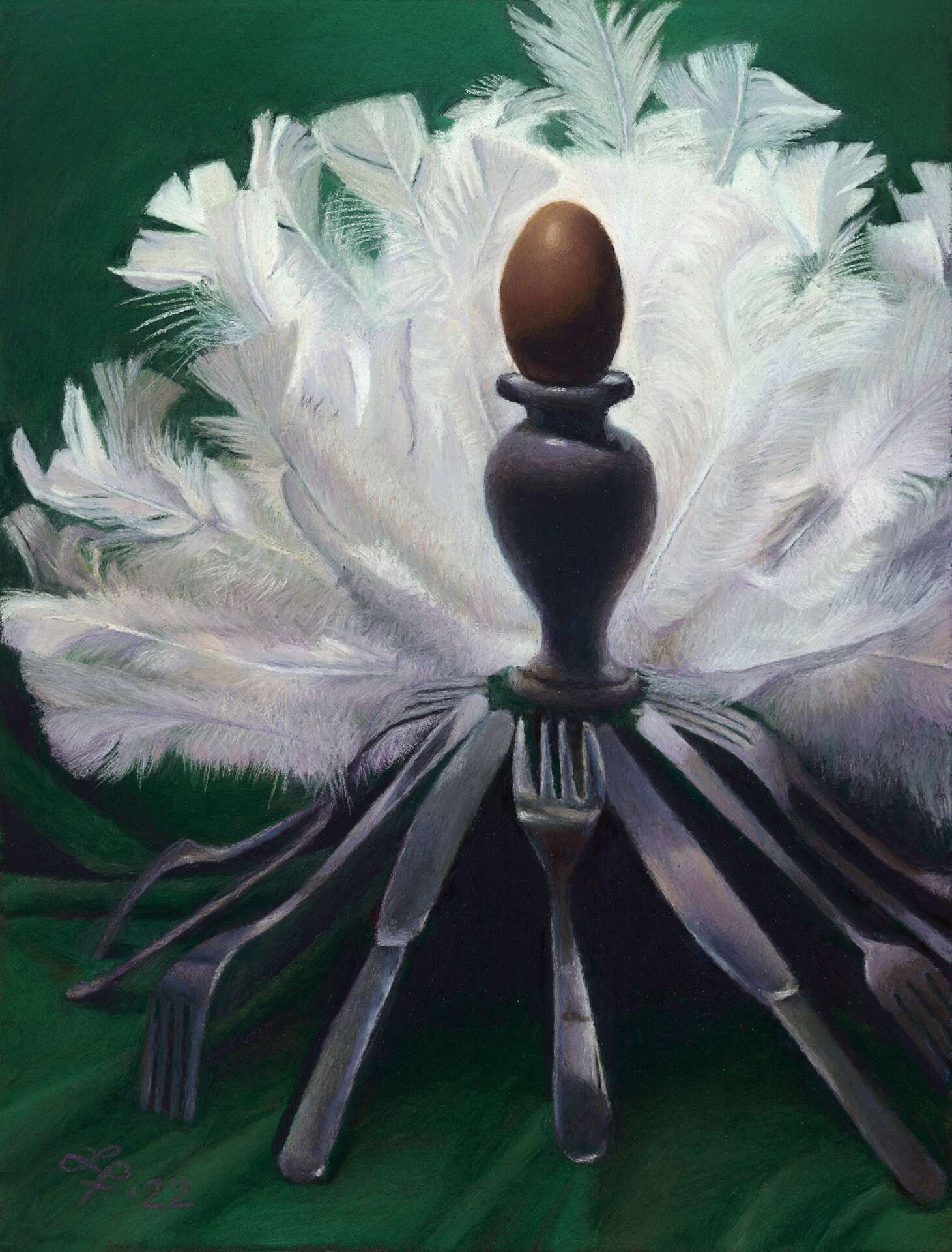 I am a Classical Realism painter and work from life–no photographs. In my black box studio I set up tableaus complete with lighting and work with the sight-size method using simple tools like plum lines, black mirrors, and a viewfinder. All of my paintings are 100% soft pastel and I use symbolism to tell stories and share my experiences and female perspective. For example a woman’s life is often said to have three parts: maiden, mother, crone–or as I like to call them: maiden, menstruating, matriarch. My latest still life used a white rose for its symbolism of purity to represent our purpose/intention/spirit and showed the rose as a bud as the maiden years when we don’t know our calling, a slightly open bud as our menstruating years when we start to mature, and as a fully open rose for our matriarch years when we know who we are and are at our most powerful.