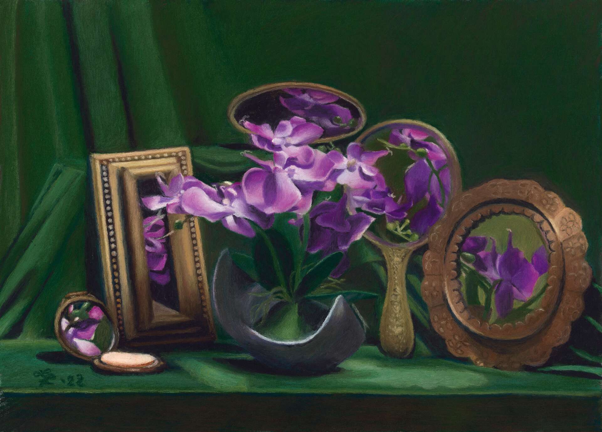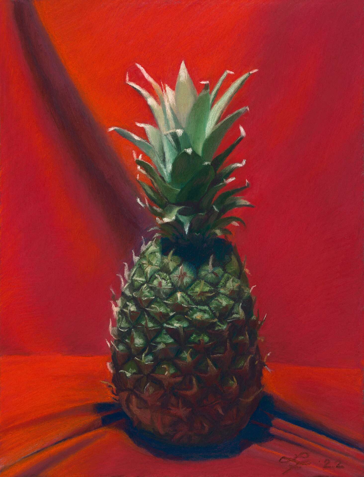 I work from life–no photographs. In my black box studio I set up tableaus complete with lighting and work with the sight-size method using simple tools like plum lines, black mirrors, and a viewfinder. All of my paintings are 100% soft pastel.