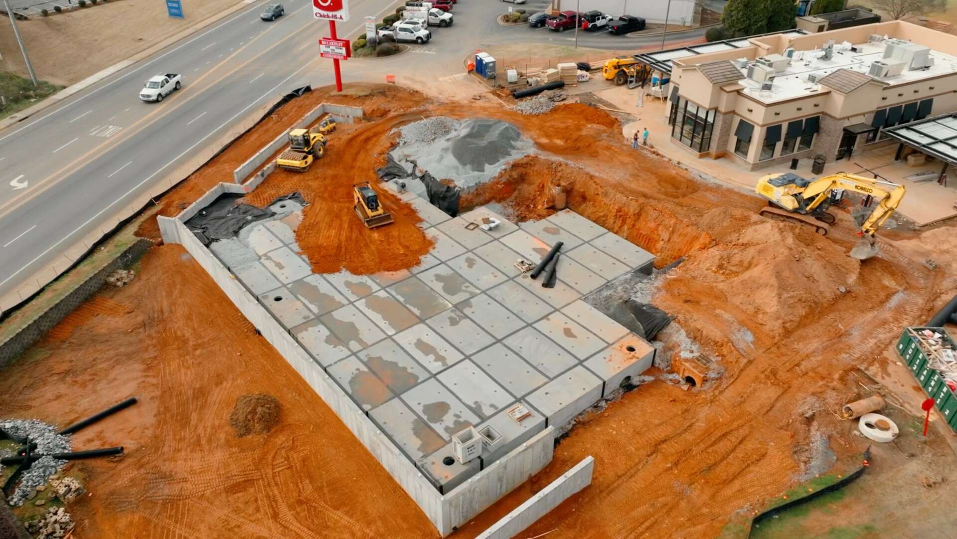 I would say the best story I could share to illustrate our resilience would be our first full package commercial job. As most people know, commercial contracts incorporate a dead line to be met; or you will be faced with fines and back charges to compensate for the inadequate completion. The biggest job we’ve completed to date was the Chic-Fil-a remodel and parking lot expansion in Boiling Springs, SC. This projected included the recently newly designed precast underground retention system produced by Storm-Trap. The start date was December 2nd, 2022. It started raining December 3rd and didn’t quit until February. Collectively, we had 4.5 feet of rainfall in the area in 2.5 months which put us behind in the worst way, leaving us with less than half the time that we originally had to complete the job. With this being said, we had to “put it in overdrive” to get this job done as originally intended. Amongst several alternatives, and other precautionary measures, we ended up working more than 110 hours per week, myself included for 5 weeks to get wrapped up. Keep in mind, that was 110 hours per person, not all together – averaging 18-19 hours a day. We worked under the moonlight many nights to get that job done, which made the end result more rewarding than me and my guys could’ve ever imagined.