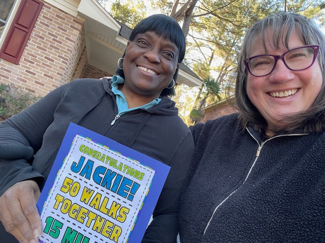 One of the people that was the inspiration for the creation of Let’s Walk started walking on 9/15/2021. She was relatively young at 61 and was 5 years post-stroke. She was determined to maintain her independence and continue to enjoy her life. She loved getting outside in her vibrant community and remembered everyone’s name and what they would order when she was working at the local McDonald’s. Getting outside and interacting significantly enhanced her quality of life. She also got her 85 year old neighbor started with the program as he would sit outside enjoying the sun but did not ever get any exercise. He was initially reluctant to participate as he suffered with knee pain. After walking just 1 time a week for 4 weeks his knee pain resolved and he now walks 2 x a week with different volunteers and is able to walk to a nearby grocery store where he can get his favorite snacks.