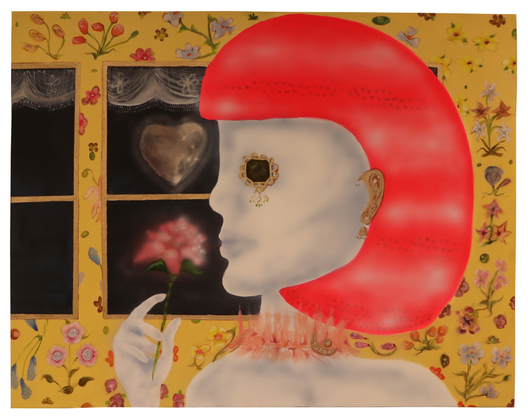 It is human nature to be attracted to beautiful things, and I use the same language to attract viewers with my paintings but then present a mirror to them. I think a lot about the ideas of desire and the gender politics of reducing a woman’s worth to just her attire. I find power in that objectification. I like to imbibe a sense of musicality to my pieces, and I am extremely inspired by Sufi literature and song lyrics- particularly the ones allegorising the female icon.