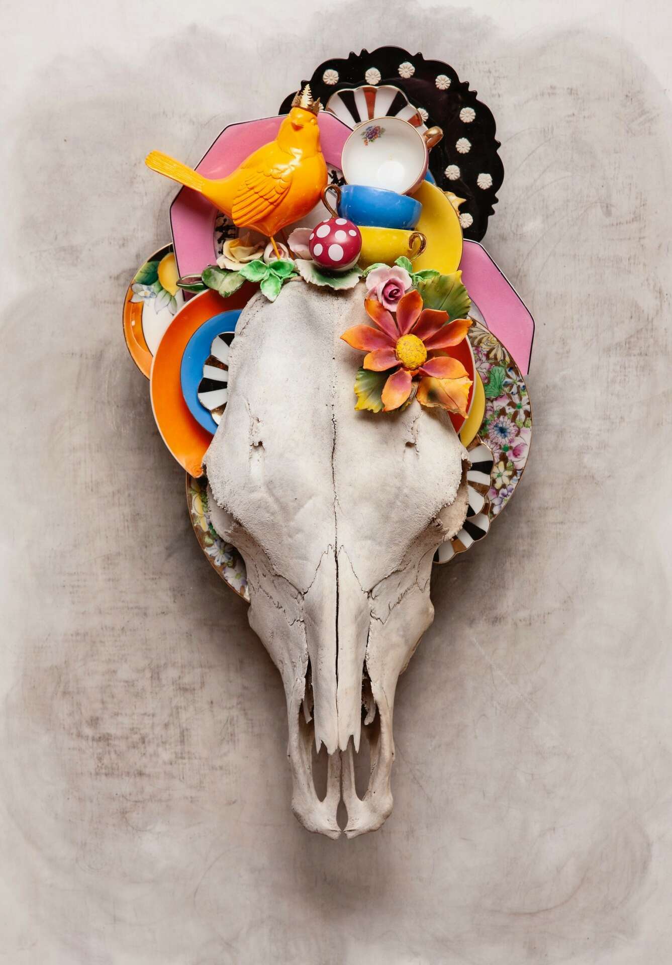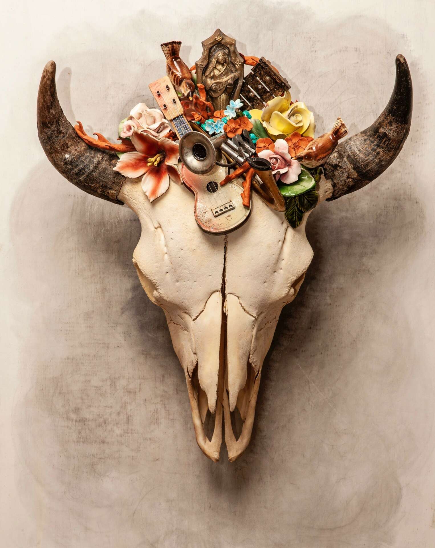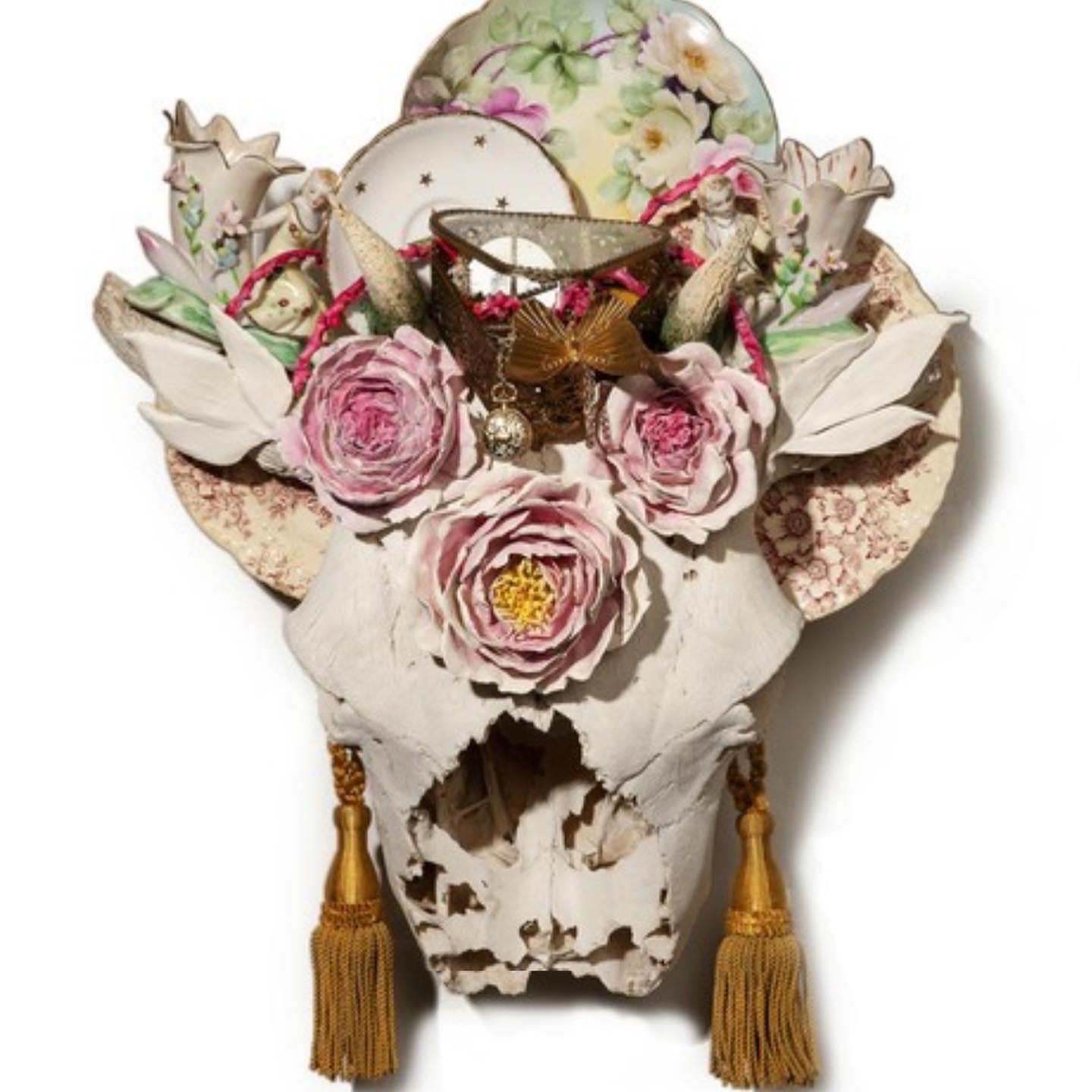 Since ancient times flowers have been used in ceremonies across the world. The flower’s significance is that of life and death and the rebirth of hope. While working in different flower shops it became evident that flowers were part of a visual language about life and its many celebrations and sorrows. It only seemed liked a natural progression for me to incorporate flowers into my own artwork. Hand sculpted ceramic earthen ware flowers have become part of my signature style. One of my favorite pieces to work on would be Majestic Bison skulls adorned with ceramic flowers that tell a story of nurture, nature, strength and sacrifice.
