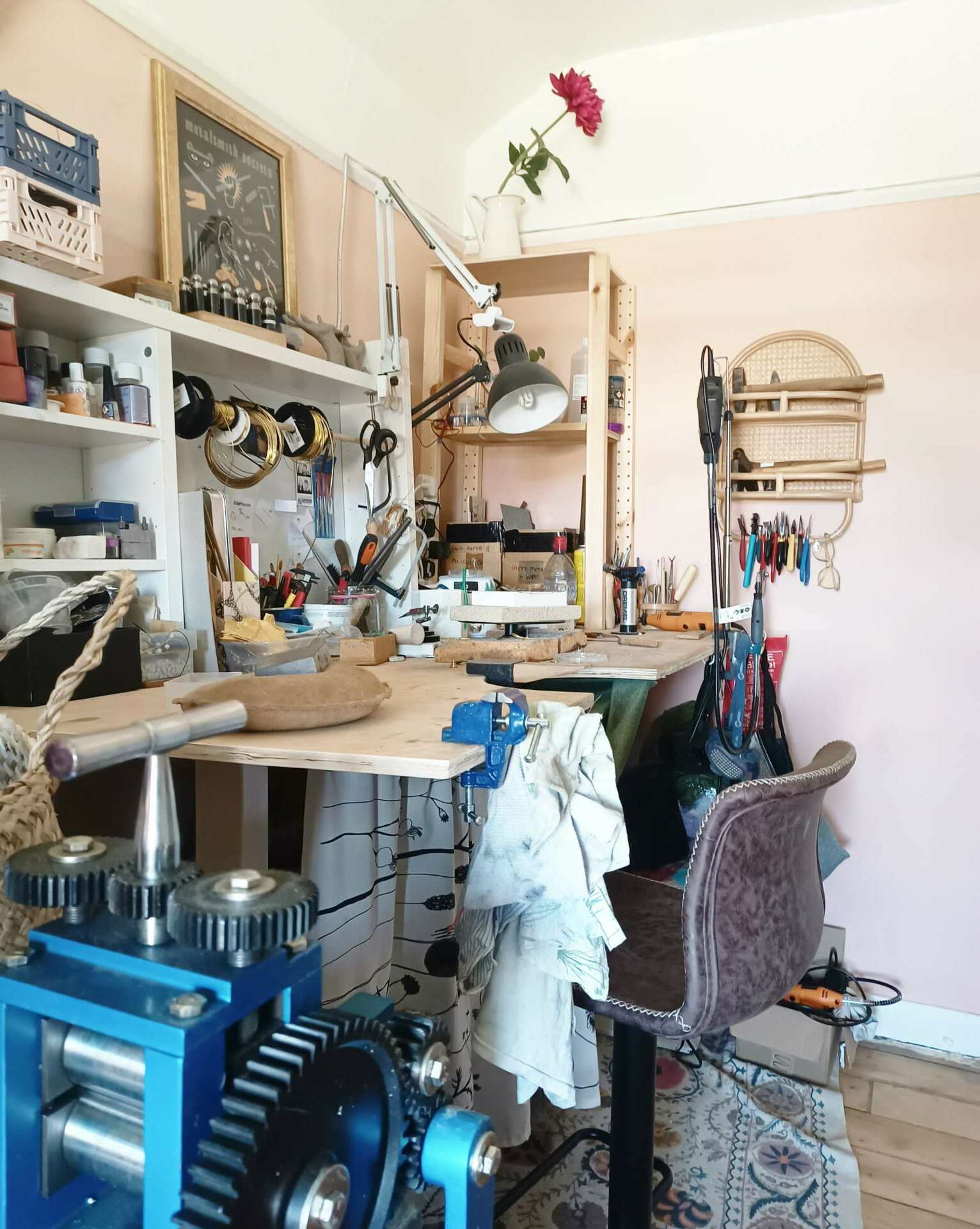 To start out, I invested no more than £200 in a 10-week course and ca £250 in tools and materials. If you go at something creatively, someone’s trash can be your next tool. I didn’t want to ivnest in a £50 tool, so I looked around at what I already had and realised a cookie dough roller did the job perfectly. Yes, there are excellent pliers you can buy specifically for jewellery making, but the thrift store had a used pair for a fraction of the price, and it comes with history. I think not being precious about how someone says something ‘should’ be done is very important. Keeping an open mind or even setting yourself challenges can be very successful. And as the business grows, reinvesting and making those leaps will bring you forward.