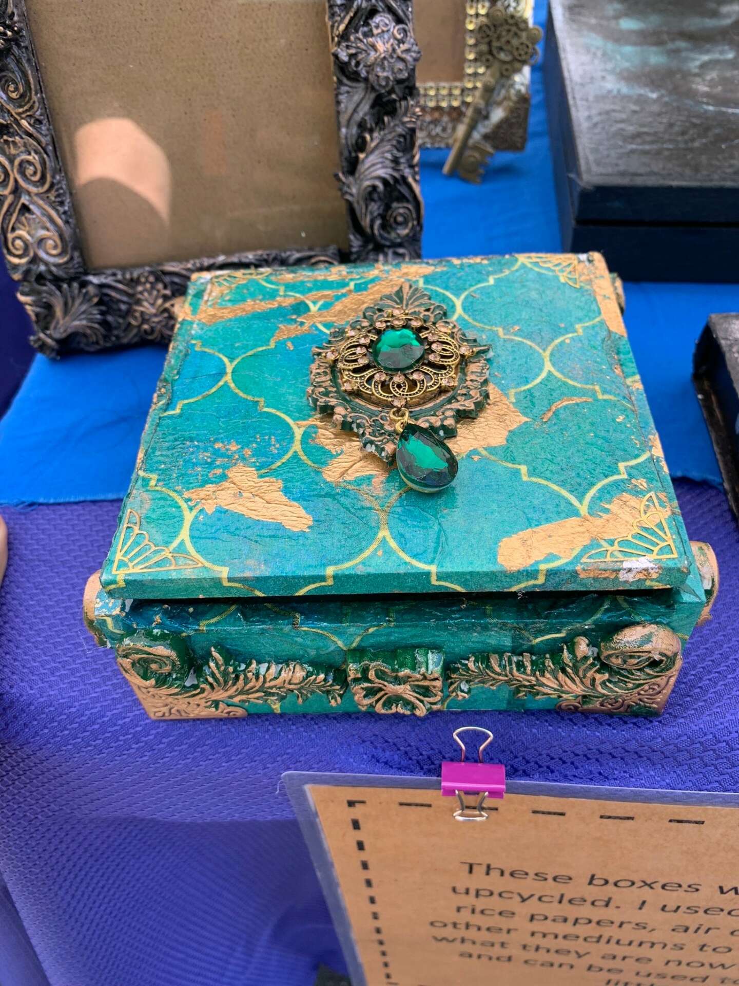 My expertise now extends to knitting, crocheting, decoupage, resin, collage, and more. I think I’d like to get into costume design someday. Did you know that I design my masquerade masks? Those are deeply personal to me and represent parts of my healing journey. I’ve struggled with my mental health for over a decade and exploring new forms of creativity makes it easier to cope. I also knit and crochet wearables, and you can find me at craft shows selling handmade hats. Lately, I’ve been going back to mixed media art by adding my spin on wooden frames and thrifted cigar boxes and jewelry boxes.