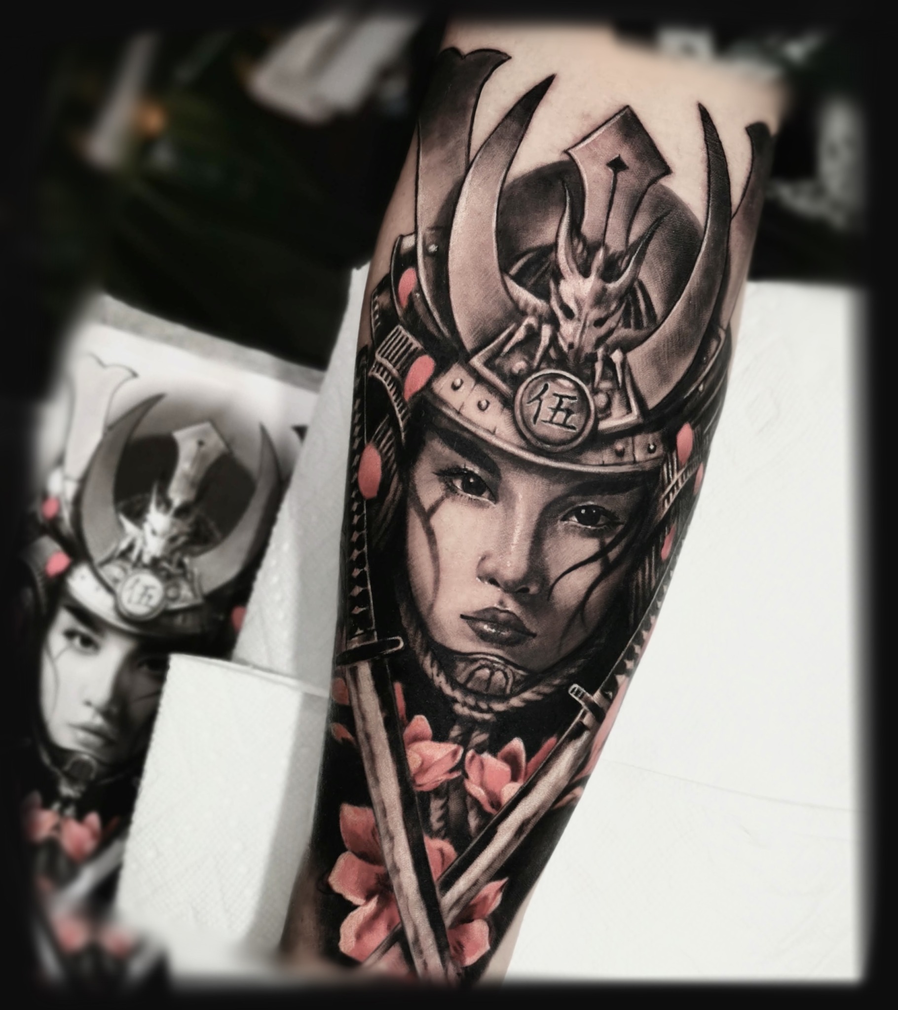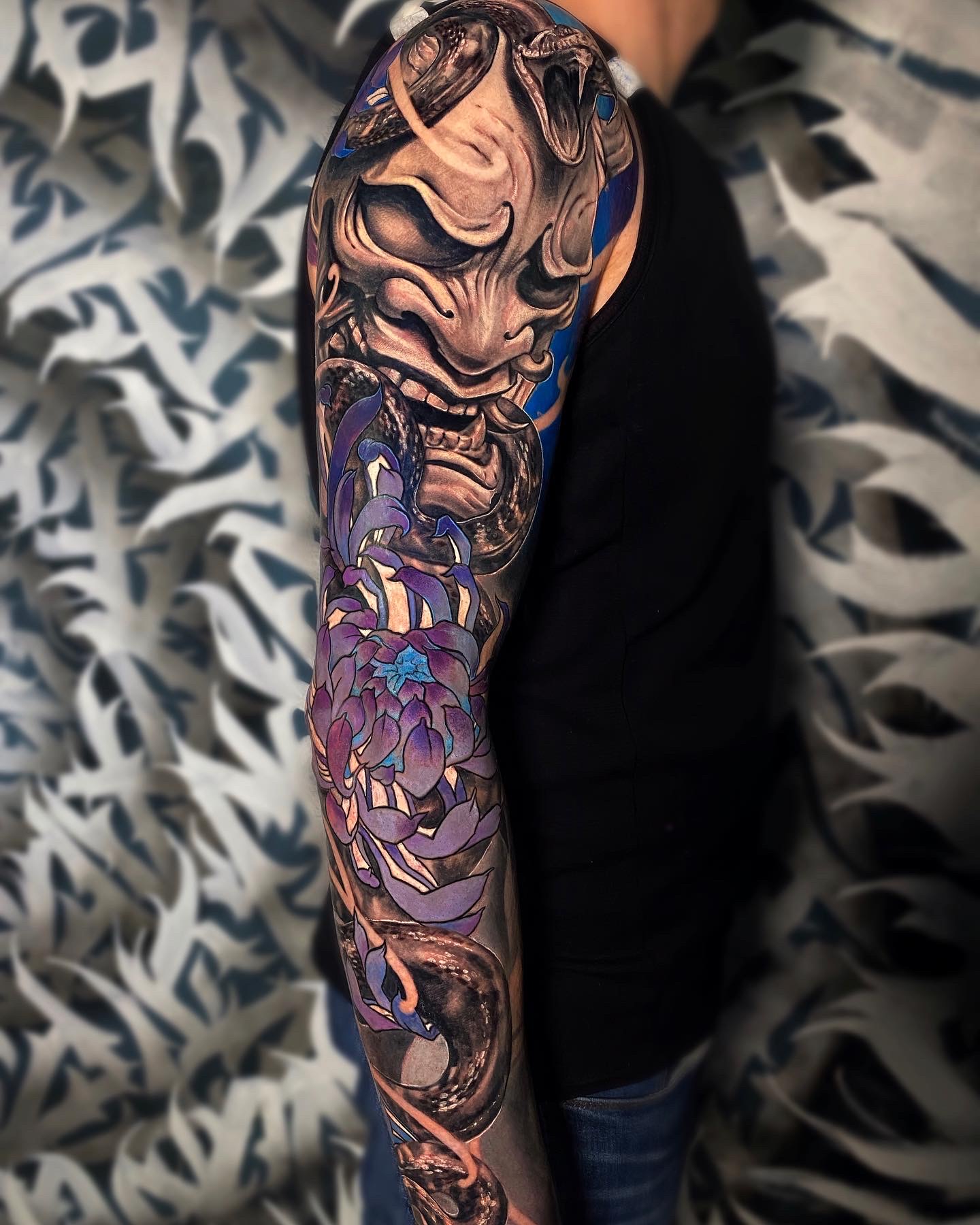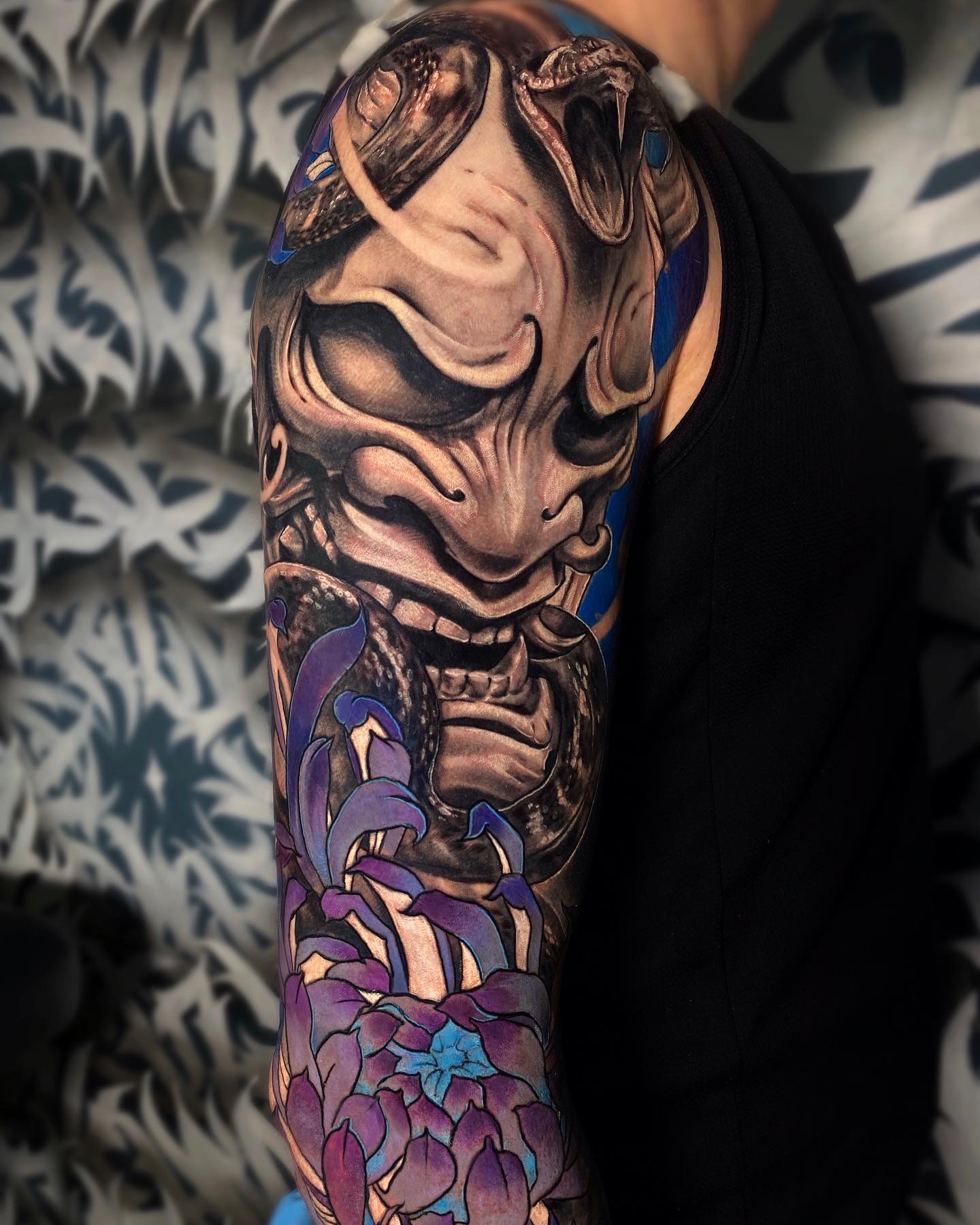 My clients often choose dark themes, such as vampires and other mysterious characters. This gives my work a special atmosphere. I love mixing styles, for example, combining black-and-grey realism with Japanese elements, which allows me to create complex and unique projects.
