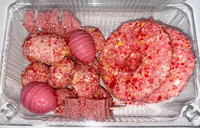 BlessEm Sweets specializes in Candied Fruit, but we also offer Custom Chocolate Heart Molds, Chocolate Strawberries, Chamoy Pickle Kits, and Rice Krispy Treats. Candied fruit is the combination of fruit and candy in one. We offer over 25 different flavors to choose from and a variety of fruit options. Fruits such as grapes, cherries, pineapples, strawberries, pickles are coated with a hard candy, dusted with a sweet, sour, or spicy topping, and chilled to serve.