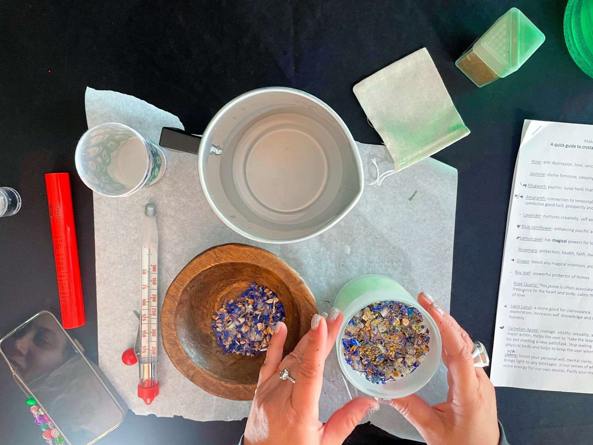 By 2022, I decided to take my knowledge of herbs, crystals, and candle making and create classes to share the art with those who also felt called to the practice of candle making. Over the last two years, I have taught dozens of classes and met many students who have branched off into their own candle making businesses. I offer coaching through the beginning stages of their businesses, to make sure they’re set up properly and feel confident in their products. We work together to find their purpose, their goals, and their individual style through candle making. My students share a passion for sharing their own healing journeys, using candle making as their way of telling the story. I love to brainstorm with and guide them through the product development stage, help them to find their niche, and watch them grow into established businesses that share so much love.