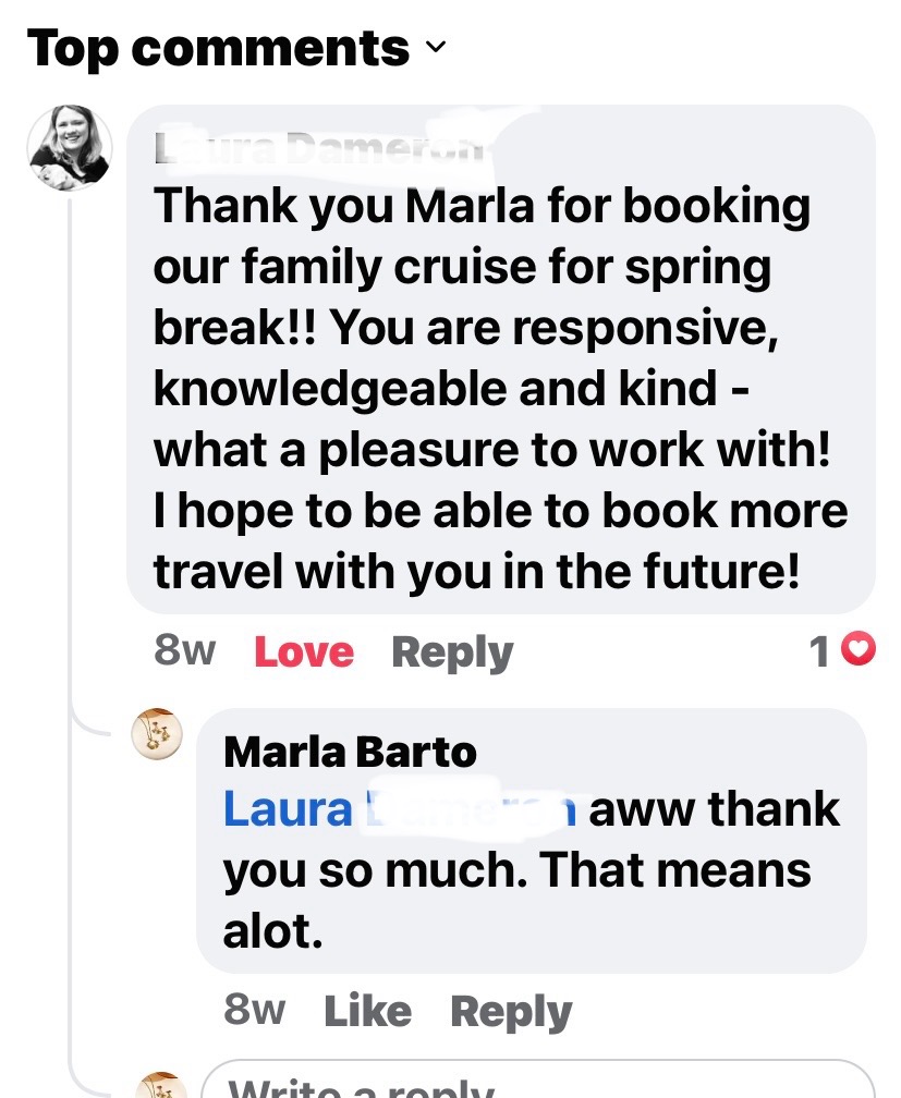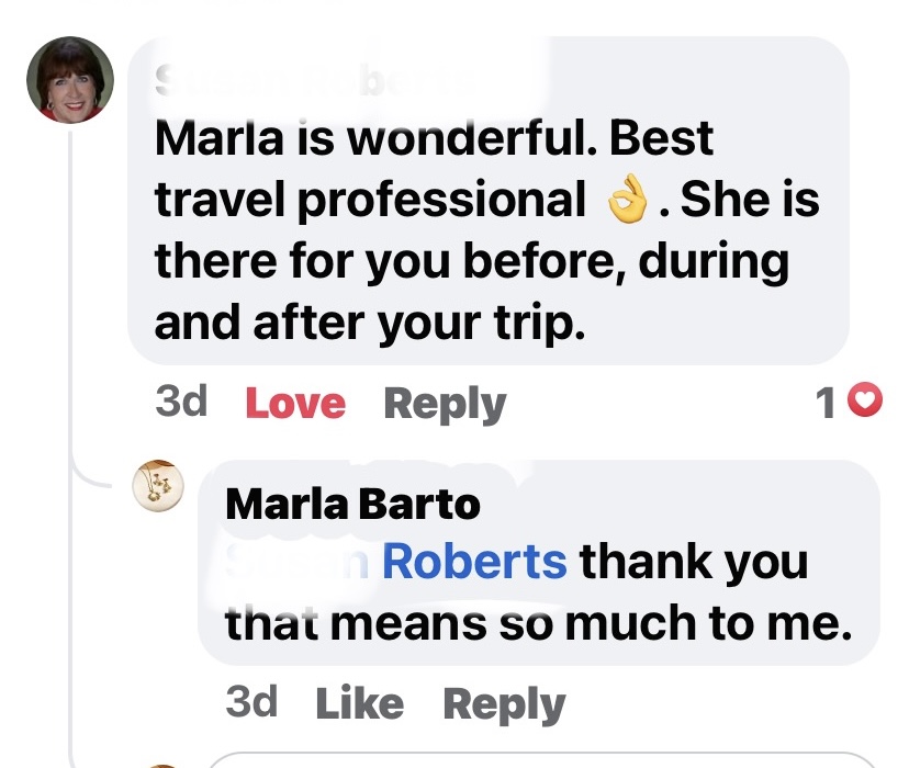 You have the same person to talk to about everything instead of going through automated prompts and getting somebody new each time you call. I am available to reach virtually anytime (when I am awake) via text, facebook, Facebook messenger, email and of course by phone. I work 7 days a week. I am with you from the time you plan your vacation all the way through your vacation. If you have any questions or problems while you are away, I am there to help. One of my favorite things about being a travel agent is when my clients are texting me and sending me pictures while they are away and telling me all the fun they are having. I love when people on social media ask for travel agent recommendations and my name is mentioned a few times by my loyal clients that have used me. I love the accolades and reviews they give me. I know I do a great job and give them my all but it is so nice to hear it from them.